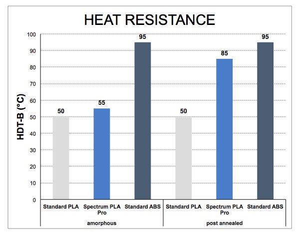 Filament Spectrum PLA Pro można poddać obróbce w wysokiej temperaturze przy użyciu komory grzewczej. Po krystalizacji wydruku model charakteryzuje się zwiększoną odpornością termiczną oraz prawie dwa razy wyższą niż ABS odpornością na uderzenia.
