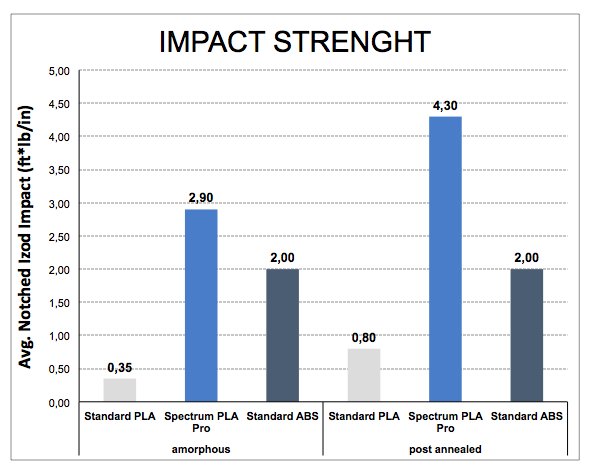 Filament Spectrum PLA Pro po wydrukowaniu wykazuje się prawie o 50% wyższą udarnością niż materiał ABS. Wykonując wydruki z materiału Spectrum PLA Pro unikamy wszelakich trudności takich jak: skurcz czy nieprzyjemny zapach występujących przy druku z ABS.