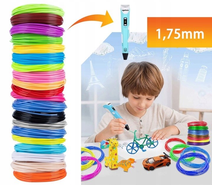 Filamenty wykonane są z PLA (poliaktyd), który cechuje się dużą wytrzymałością i trwałością. W komplecie znajduje się aż 20 kolorów, dzięki czemu z użyciem odpowiedniego sprzętu oraz własnej wyobraźni, można stworzyć prawdziwe dzieła sztuki.