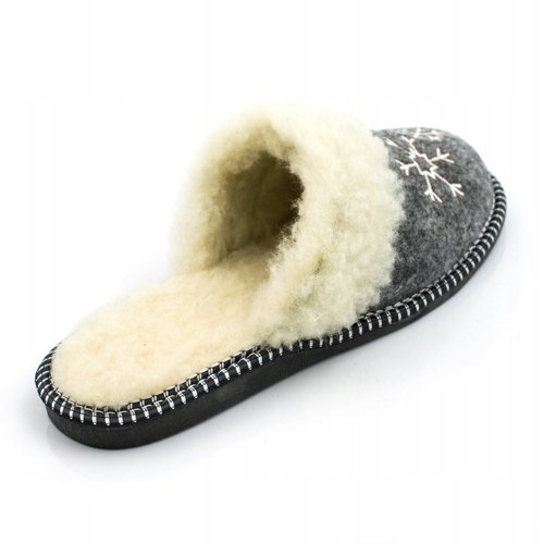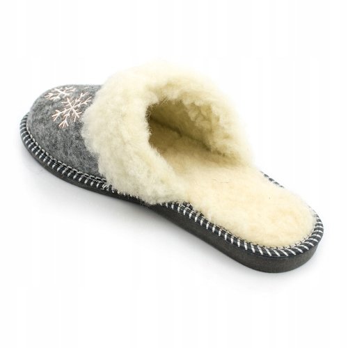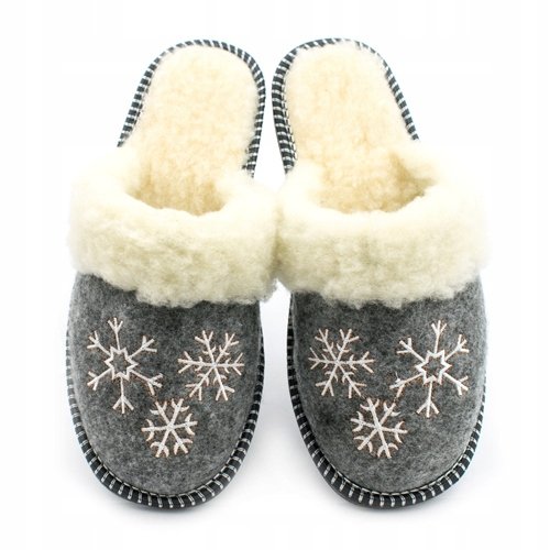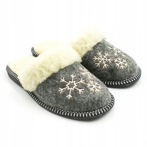 Damskie, filcowe kapcie z ciepłą wełnianą wkładkąSzary Kapcie damskie - parametry:Wysokość obcasa: 21 mmWysokość pod palcami: 5 mmWzory: gwiazdki śniegoweKolor: szaryDodatkowe: ...