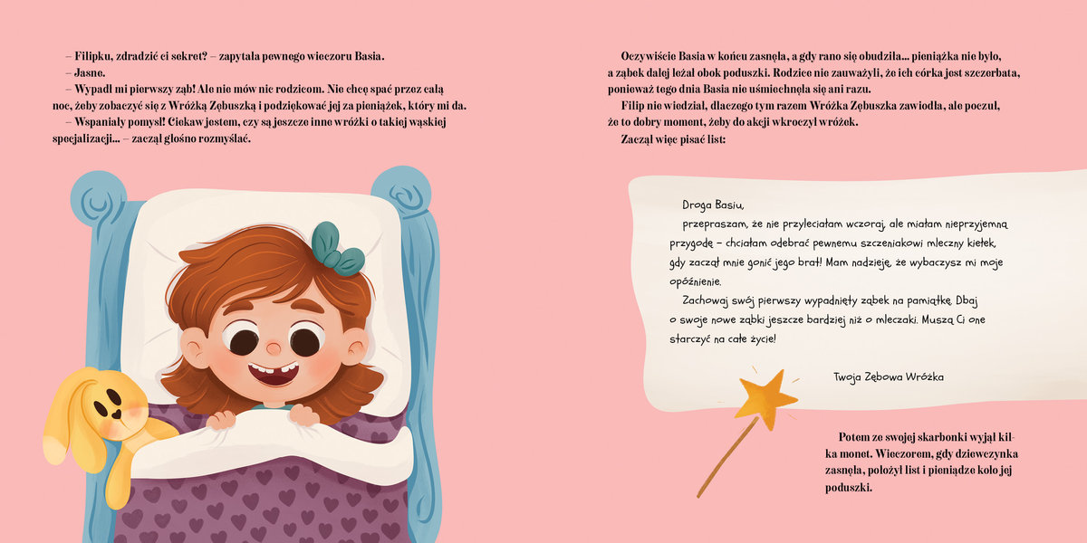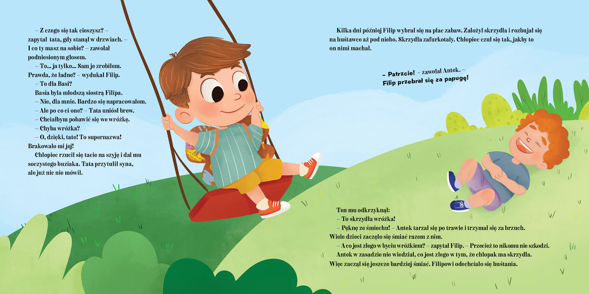 Filip marzył, by na bal przebrać się za wróżka. Niestety tata nie rozumiał tego pomysłu – chłopcy przecież nie przebierają się za wróżki… Prawda? Ostatecznie Filip poszedł w stroju astronauty. Na balu był smutny. Pewnego dnia sam zrobił sobie skrzydła. Ubrał się tak, jak zawsze chciał. I choć niektórzy się śmiali – on był szczęśliwy. Inne dzieci zaczęły się z nim bawić udając wróżki i wróżków. A gdy młodszej siostrze Filipa wypadł ząb i zębuszka nie przyszła… założył skrzydła i został wróżką zębuszką. Rodzice nie mogli powstrzymać wzruszenia.