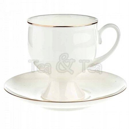 Stylowa filiżanka z wysoko cenionej rosyjskiej porcelany na charakterystycznej nóżce, której wysmakowaną formę podkreślają ręcznie zdobione 22 karatowym złotem brzegi.