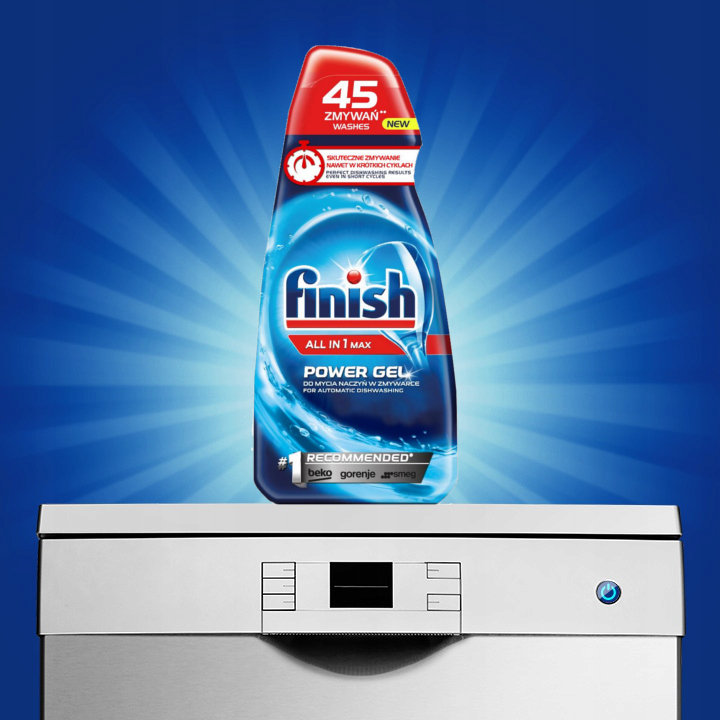 Nowa szybko rozpuszczalna formuła zawarta w Finish All in 1 Max żel do mycia naczyń w zmywarce, zapewnia doskonałą czystość i połysk jakich oczekujesz, nawet w krótkich cyklach. Zapewnia dodatkową ochronę przed korozją szkła, dzięki czemu Twoje naczynia zachowają swój olśniewający połysk na dłużej i będą chronione podczas każdego zmywania.