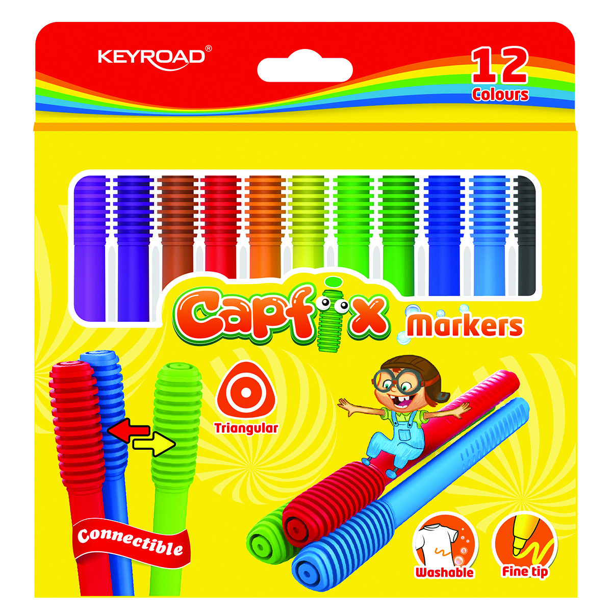 Flamastry Keyroad Capfix Markers, zmywalne, 12 kolorów uniwersalne flamastry/markery do użytku: w domu, w szkole i w przedszkolu ergonomiczna, trójkątna i antypoślizgowa obudowa gwarantująca ...