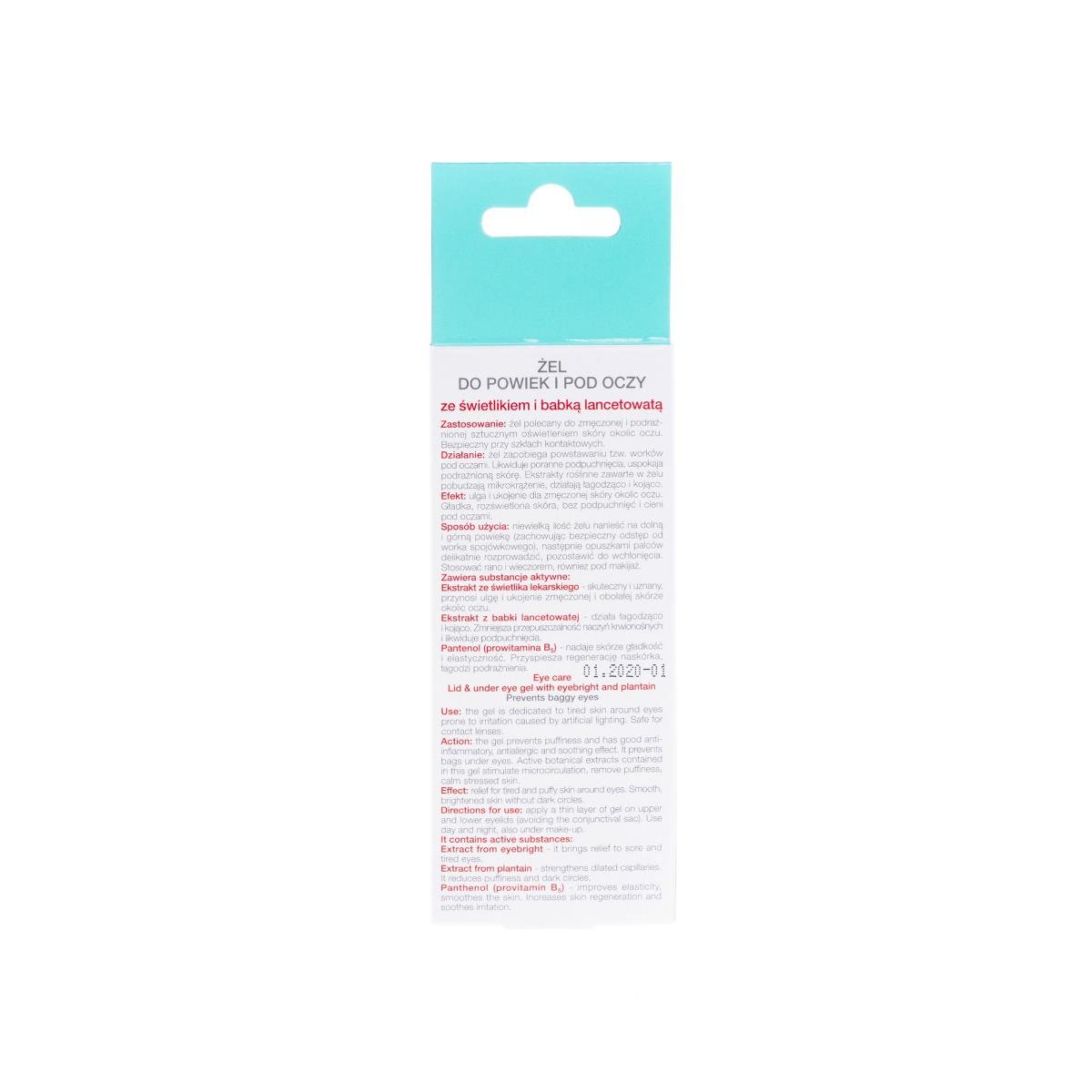 Sposób użycia: niewielką ilość żelu rozprowadzić równomiernie na dolnej i górnej powiece, zachowując bezpieczny odstęp od worka spojówkowego. Pozostawić do wchłonięcia. Stosować rano i wieczorem, również pod makijaż.