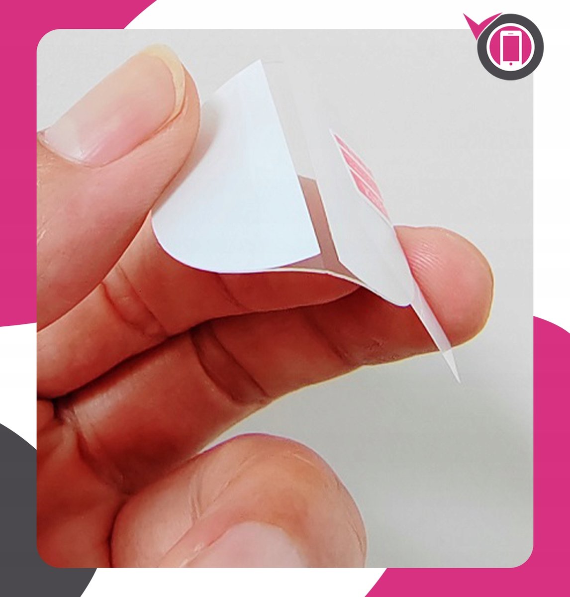 Klej pokryty jest drobnymi szklanymi koralikami, dzięki którym można przesuwać folię na powierzchni przed dociśnięciem.