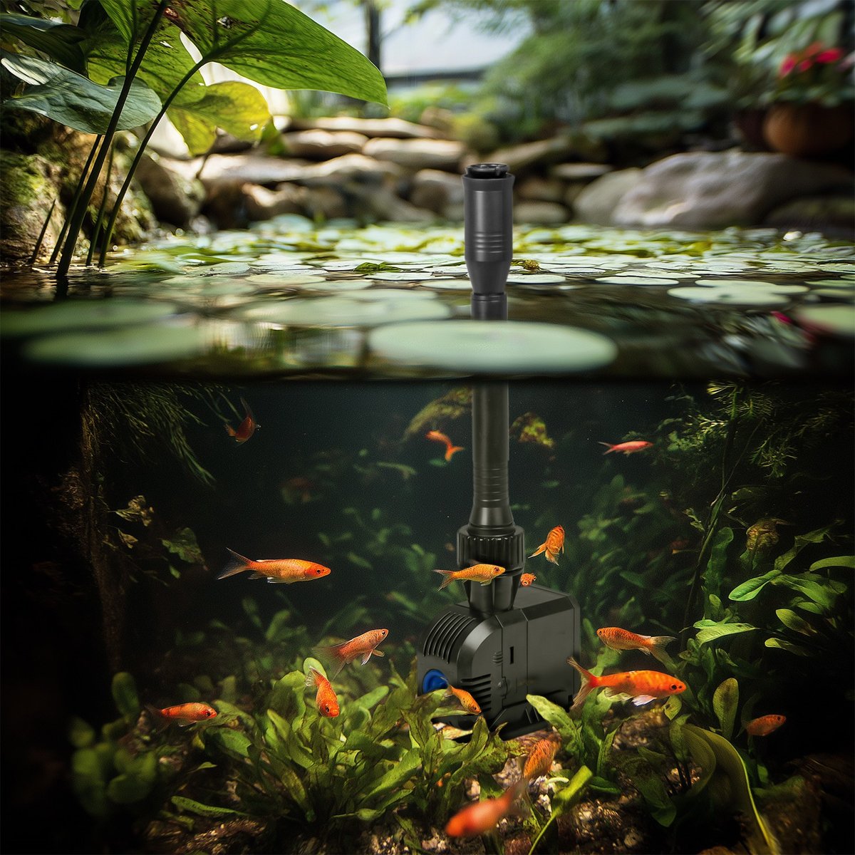 Wbudowany filtr gąbkowy wstępnie oczyszcza wodę, a dodatkowy króciec na wąż (12mm i 16 mm) pozwala podłączyć inne urządzenia, np. wodospad czy filtr zewnętrzny. Dzięki gumowym nóżkom i przyssawkom urządzenie stoi stabilnie i cicho, nie zakłócając ogrodowego spokoju.