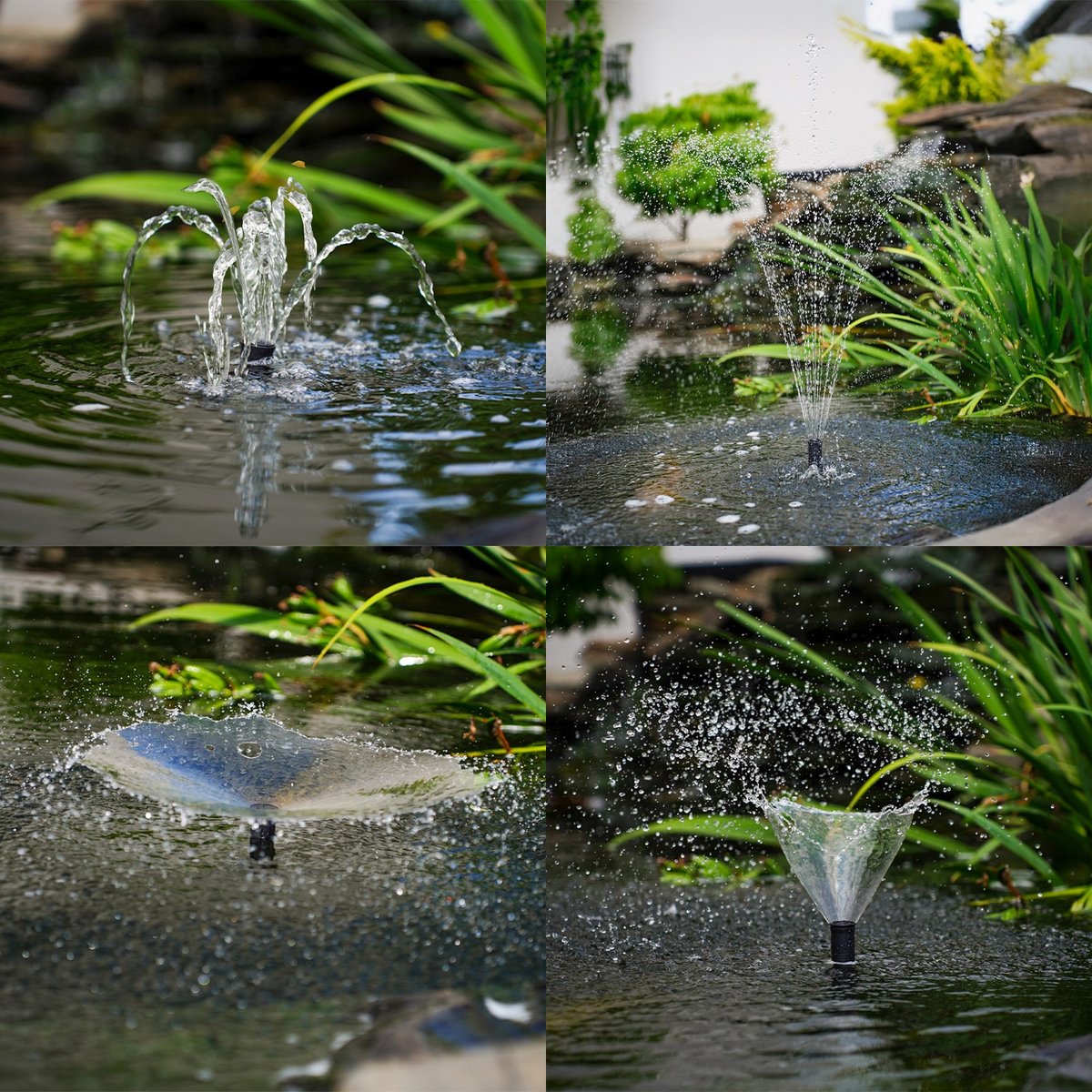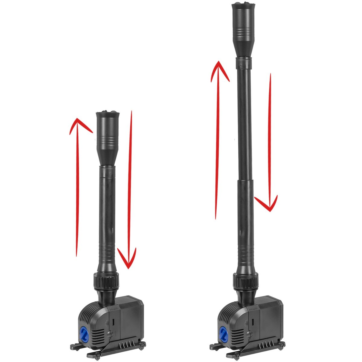 Dzięki regulowanej mocy pompy sam decydujesz, jak intensywnie ma pracować system. Ta regulacja pozwala również zmieniać kształt fontanny, a dodatkowo korzystając z dołączonych 4 końcówek — od delikatnej mgiełki po efektowny strumień. Fontanna ma też teleskopową dyszę, którą dopasujesz do głębokości swojego oczka.