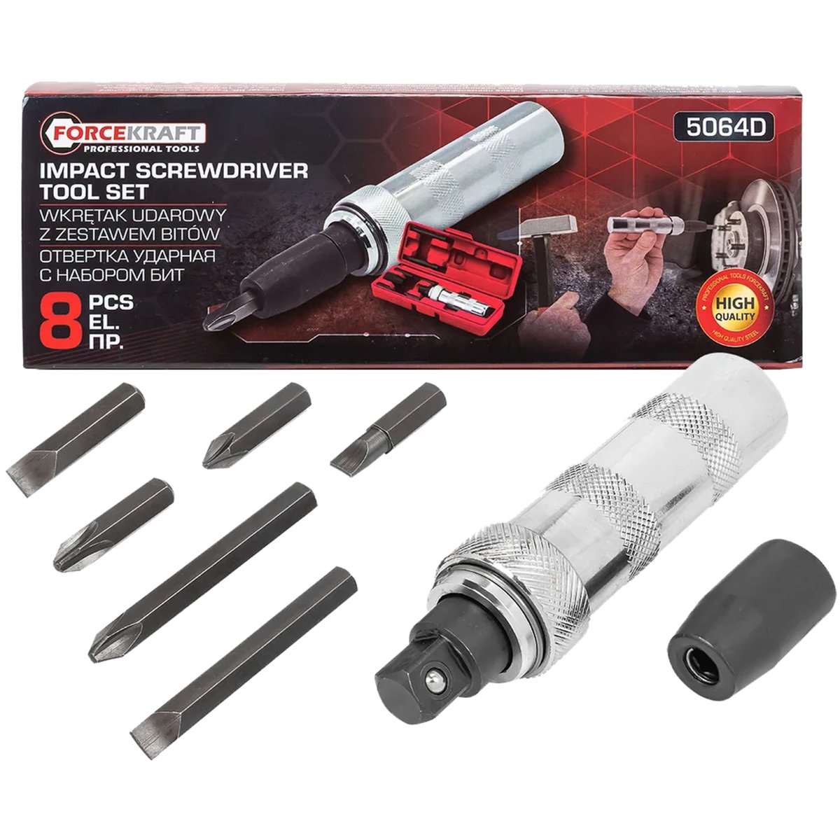 Wkrętak udarowy Forcekraft z zestawem końcówek i adapterem to wszechstronne, wytrzymałe i niezwykle skuteczne narzędzie przeznaczone do pracy z połączeniami gwintowymi. Idealnie sprawdzi się zarówno w profesjonalnych warsztatach, jak i w domowym garażu – wszędzie tam, gdzie konieczne jest odkręcanie zapieczonych, skorodowanych lub trudnodostępnych śrub.