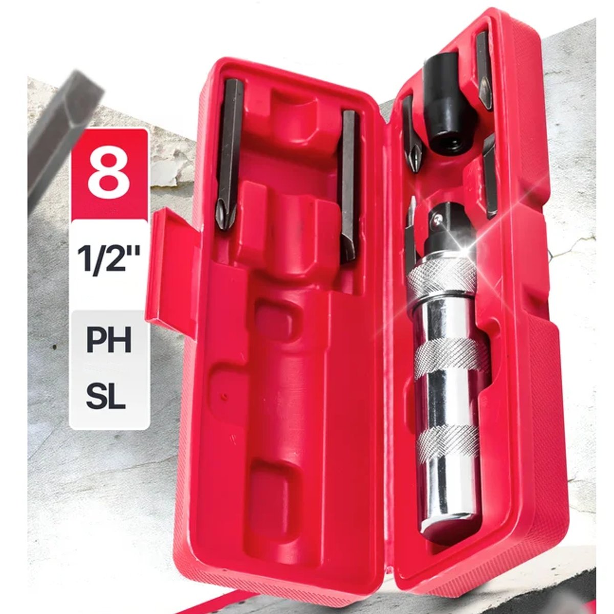 ✅ Wszechstronność – zestaw końcówek pozwala na pracę z różnymi typami połączeń gwintowych, zarówno krzyżowych (PH), jak i płaskich (SL).