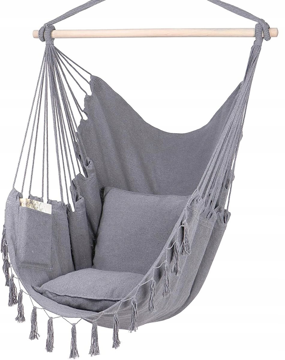 Miękki i trwały fotel hamakowy wykonany jest z miękkiego poliestru/bawełny, dzięki czemu użytkownicy mogą cieszyć się komfortem miękkiej gąbki, o doskonałej miękkości, trwałości i komforcie. Jest to więc najlepsze miejsce wypoczynku dla dorosłych, dzieci lub zwierząt domowych. UWAGA ! Brak frędzelków.