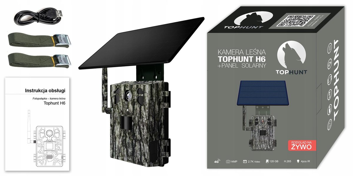 GSM 4G- 900/1800/LTE - obsługa polskich operatorów telefonicznych Zasilanie- 6x akumulator 18650 (UWAGA akumulatory muszą mieć wypukły biegun dodatni ) + dedykowany panel solarny w zestawie Panel solarny: TAK 3W Kąt czujnika PIR- ok 50st Nagrywanie na karcie pamięci- TAK - do 128GB microSD - po wykryciu ruchu z czujnika PIR - BRAK KARTY W ZESTAWIE Obsługa przez darmową aplikację- TAK Funkcja podglądu na żywo- TAK Czujnik ruchu- TAK - PIR zasięg do 25m Obiekty- F=1.8, 50st Rozdzielczość zdjęć- 14MPIX Rozdzielczość video- 2.7K Nagrywania wideo z dźwiękiem -TAK Działanie z zasilaniem zewnętrznym -Tak - bez ograniczeń Diody na podczerwień-TAK - 4 diod 940nm BLACK 3W - niewidoczne dla ludzkiego oka Antena zewnętrzna -Tak - dookólna, dokręcana ( Nowy poprawiony model 12dBi !) Regulacja czułości czujnika PIR- Tak - wysoki/średni/niski Czas wyzwolenia zdjęcia po wykryciu ruchu- ok 0.5s