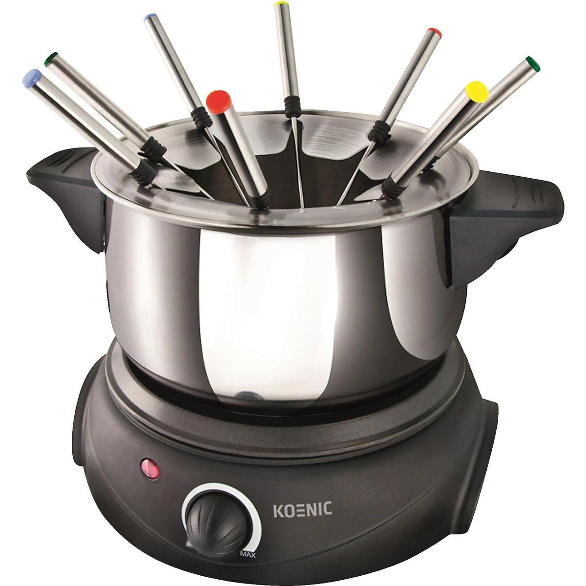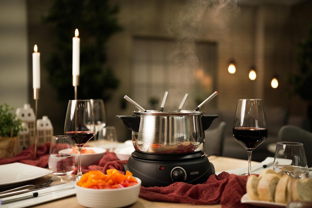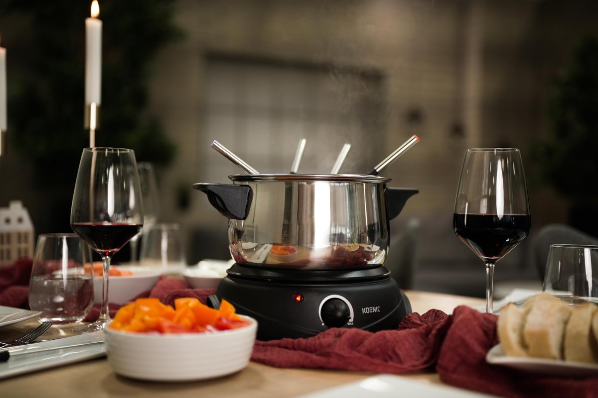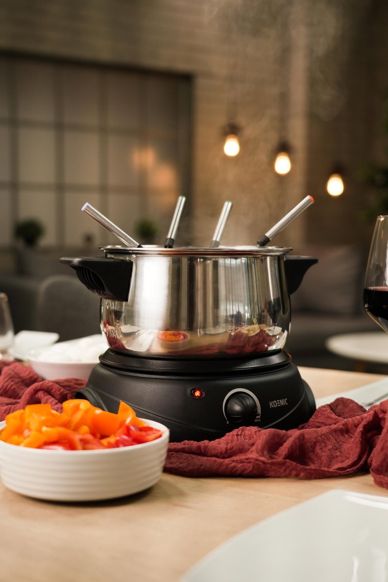 Fondue o mocy 1500 W, z płynną regulacją temperatury, zabezpieczeniem przed przegrzaniem, wyposażone w 8 widelców.