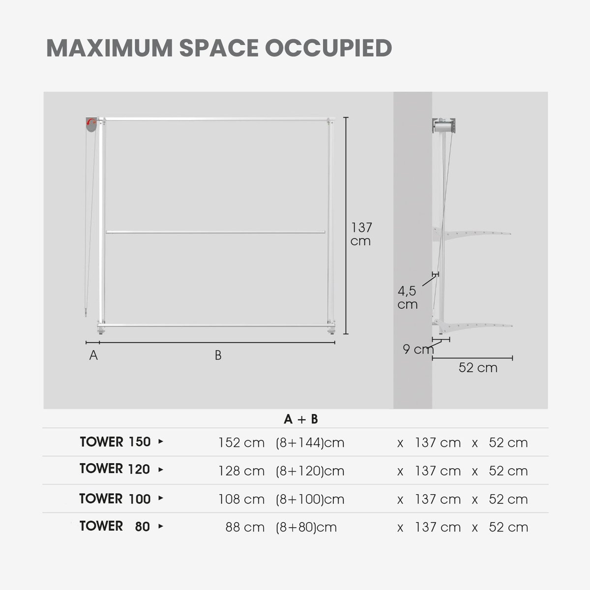 Foxydry Tower 80 suszarka na pranie wieżowa biała Informacje o tym produkcie: Foxydry Tower składa się z 3 stojaków, jeden spływa po ścianie na 1,3 metra, jeden pozostaje przymocowany na
