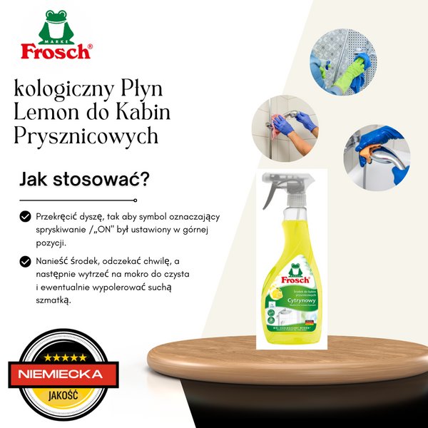 W trosce o środowisko i Twoje domowe otoczenie, Frosch Cytrynowy Płyn do kabin prysznicowych staje się niezastąpionym sprzymierzeńcem czystości. Ten 500ml ekologiczny środek zawiera w sobie moc naturalnych składników, które bezlitośnie radzą sobie z kamieniem i osadami, a przy tym pozostawiają nieskazitelnie czystą powierzchnię oraz orzeźwiający aromat cytryn. Jego zaawansowana formuła zapewnia bezpieczne użytkowanie i jest przyjazna dla Twoich łazienkowych powierzchni - z wyjątkiem marmuru i kamienia naturalnego. Dodatkowo, butelka wykonana z recyklatu otwiera drogę do odpowiedzialnego recyklingu. To nie tylko środek czyszczący, to Twój wybór na rzecz zdrowszej planety. Z Frosch Lemon każde sprzątanie staje się prostsze i przyjemniejsze, a Twoja łazienka zachwyca czystością.