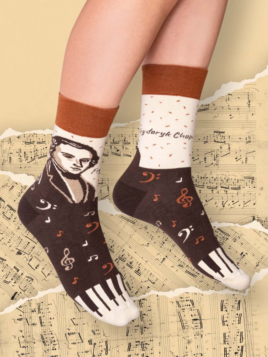 Fryderyk Chopin nie wychodzi z mody, zatem bądźmy jak on! Nośmy tylko stylowe rzeczy, jak chociażby muzyczne skarpety z wizerunkiem artysty w kolorystyce retro.
