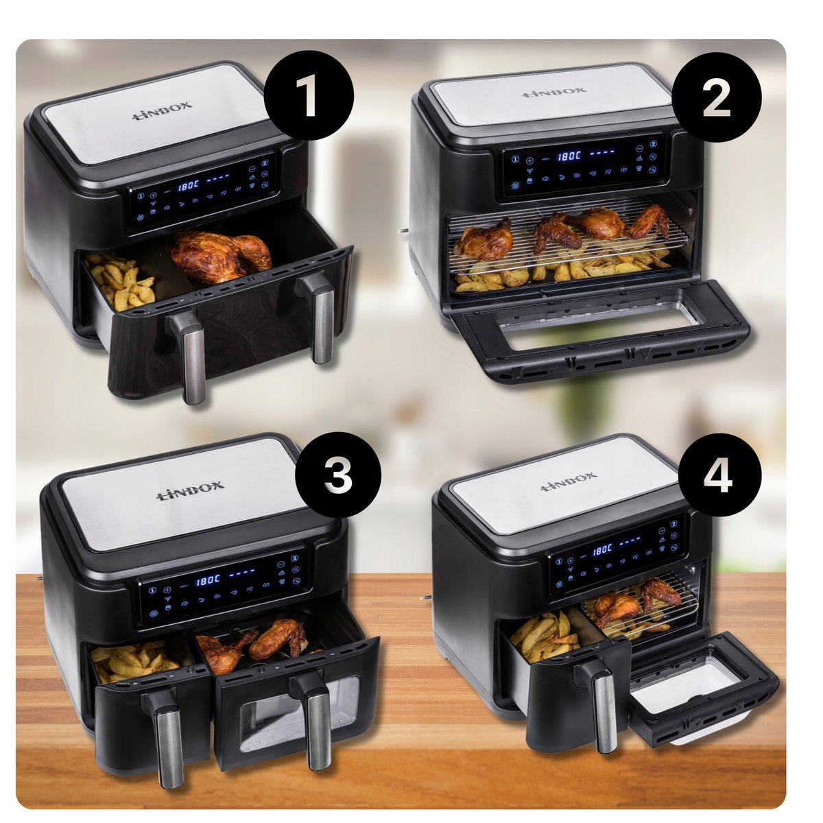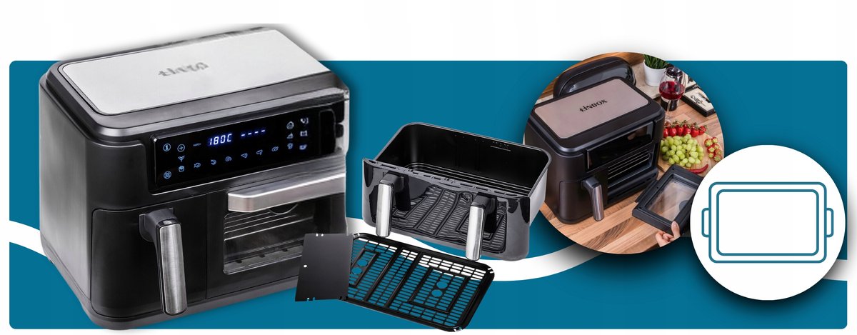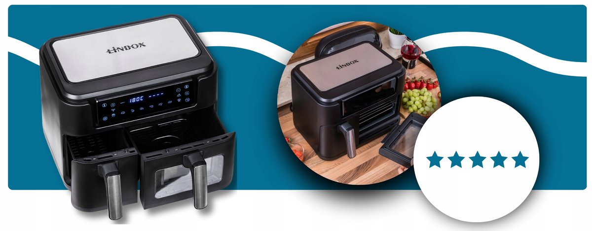 ☑️ Urządzenie wyposażone jest w funkcję piekarnika oraz dwa niezależne kosze, co umożliwia jednoczesne przygotowywanie różnych potraw.