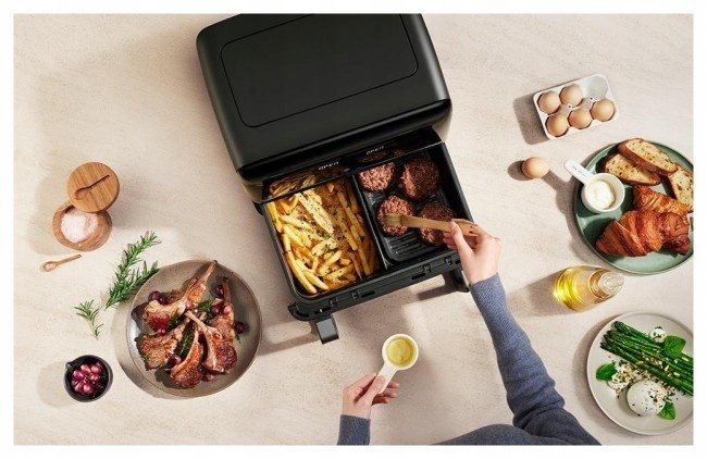 Zastosowany w urządzeniu kosz FlexZone o pojemności 9 litrów umożliwia wygodne przełączanie pomiędzy jedną dużą komorą a dwiema oddzielnymi strefami po 4,5 l każda. Dzięki temu możesz przygotować dwa różne posiłki jednocześnie – bez przenikania smaków i zapachów – lub przyrządzić większe dania, takie jak pizza, zapiekanka czy pieczony indyk, w jednej, przestronnej komorze.