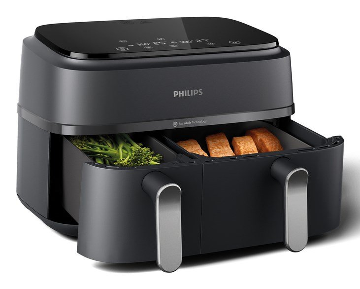 Philips Ovi Dual Basket AirFryer NA352/00 to nowoczesna frytkownica beztłuszczowa, która pozwala na jednoczesne przygotowywanie dwóch różnych potraw.
