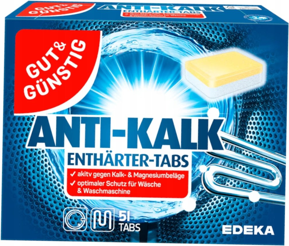 G&G Anti-Kalk Tabletki do Czyszczenia Pralki 51szt. Tabletki na kamień Gut&Gunstig doskonale usuwają kamień powstały na grzałkach, bębnach i innych częściach narażonych na kontakt z wodą, zmiękczają