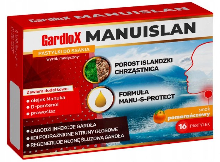 Innowacyjny wyrób nawilżająco-regenerujący gardło. Zawierający połączenie aż 3 składników nawilżających w maksymalnych dopuszczonych do stosowania na błony śluzowe gardła dawkach: porost islandzki, chrząstnica kędzierzawa i prawoślaz, regenerującego D-pantenolu oraz formuły Manu-S-Protect zawierającej dobroczynny olejek Manuka.