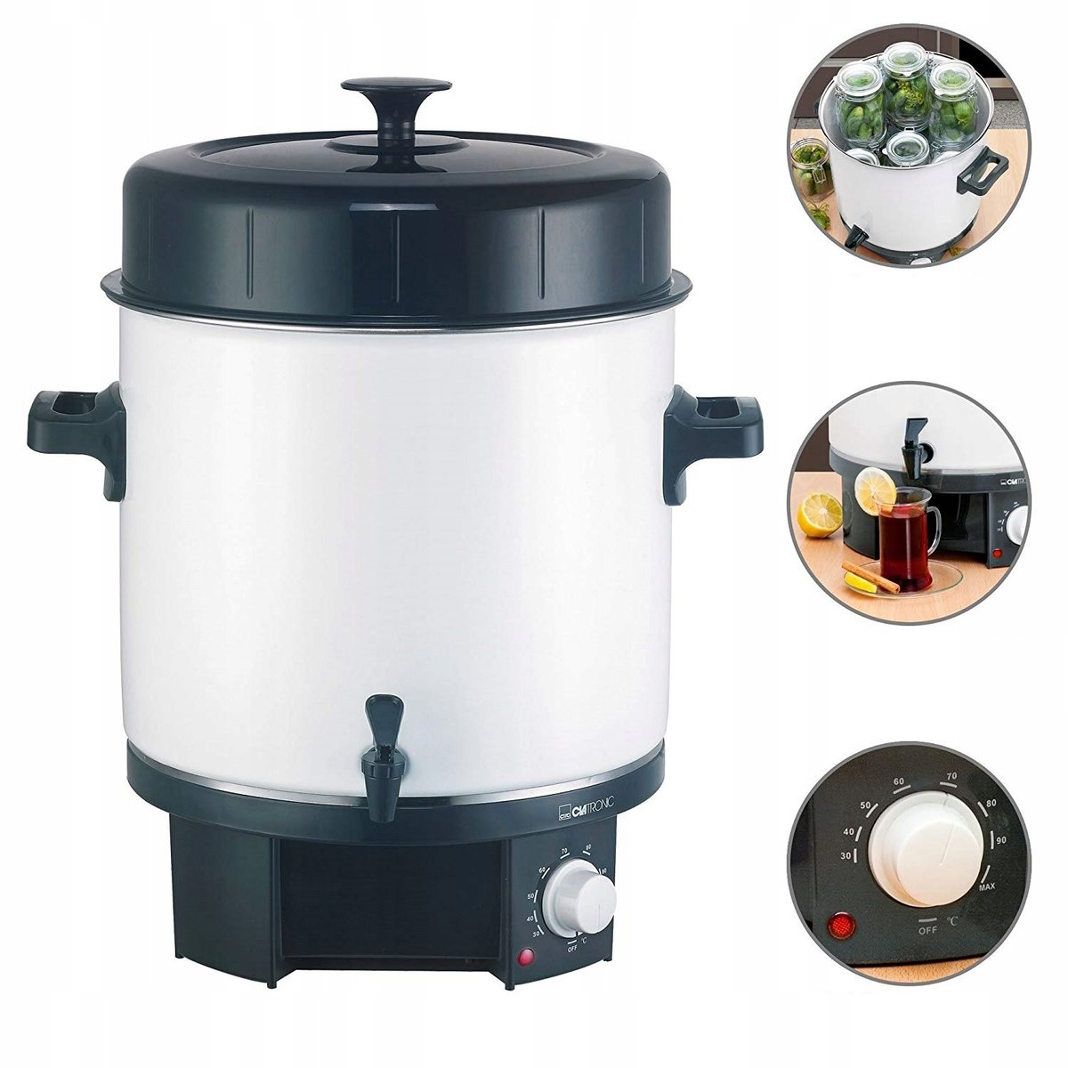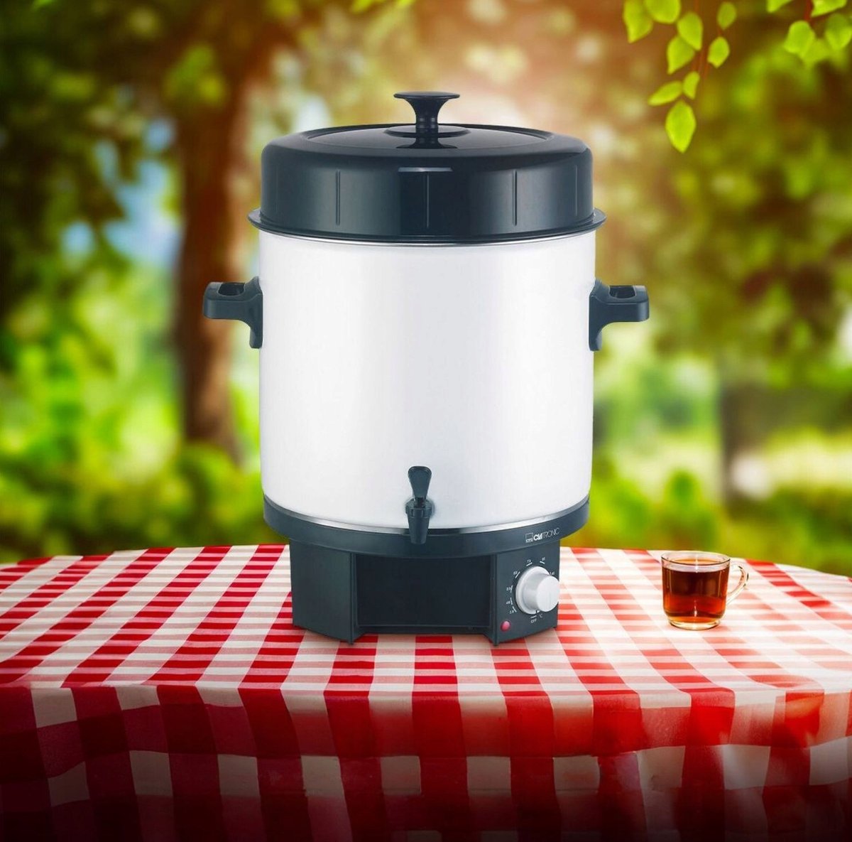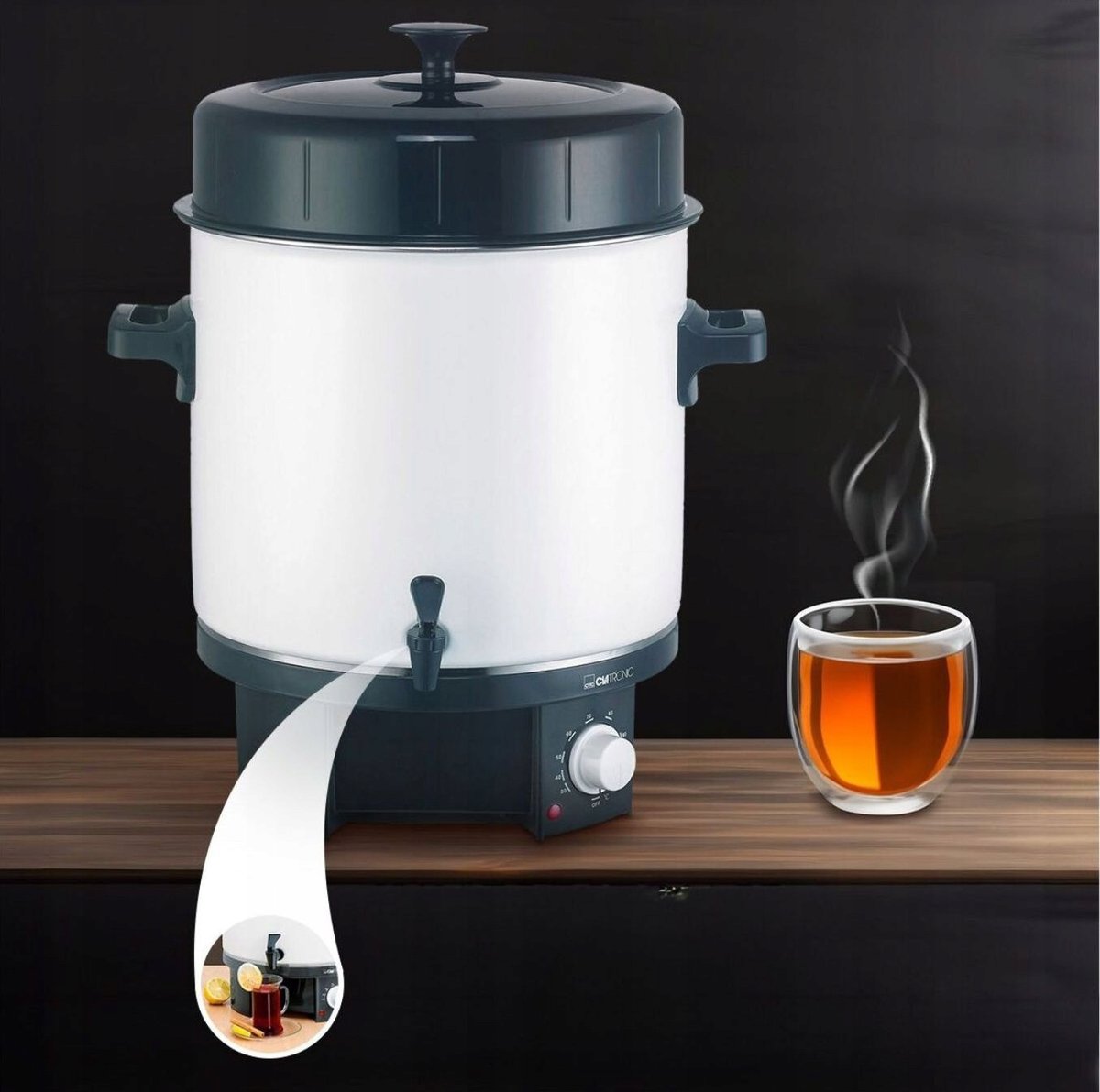 Garnek elektryczny Clatronic CTC 263135 pojemności 25 litrów doskonale sprawdzi się podczas gotowania słoików z przetworami. Dodatkowo, urządzenie wyposażone zostało w zawór kurkowy do napełniania np. winem grzanym, ponczem lub innymi gorącymi napojami.