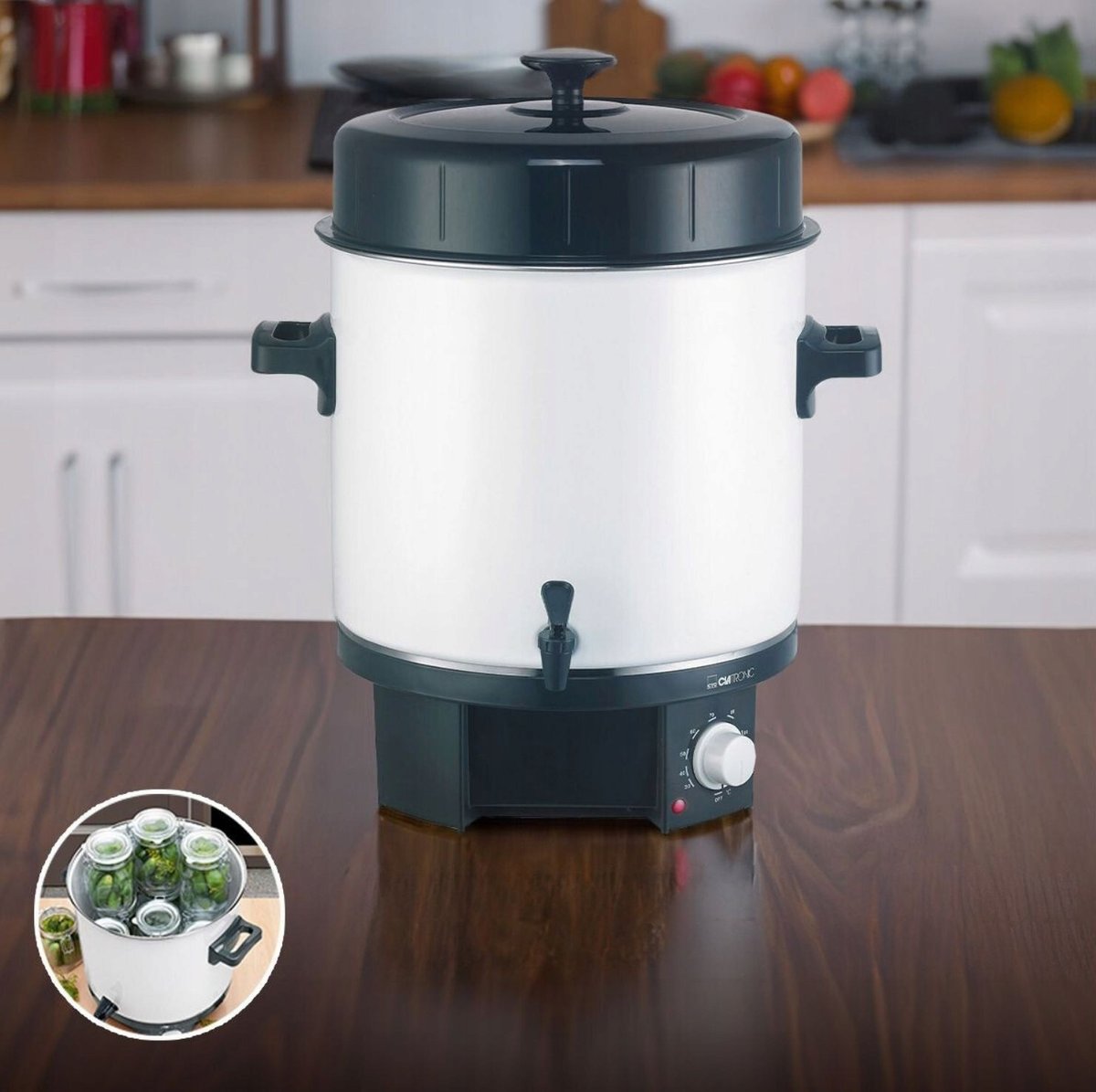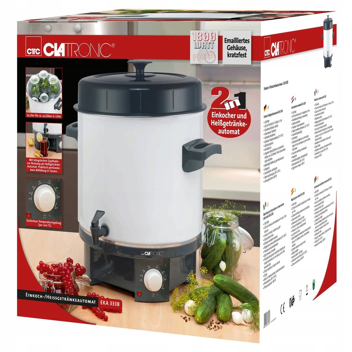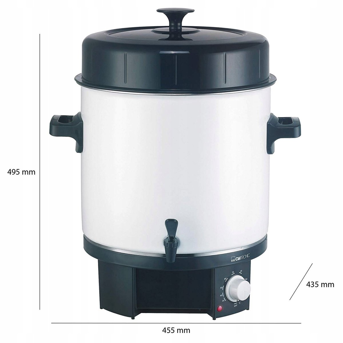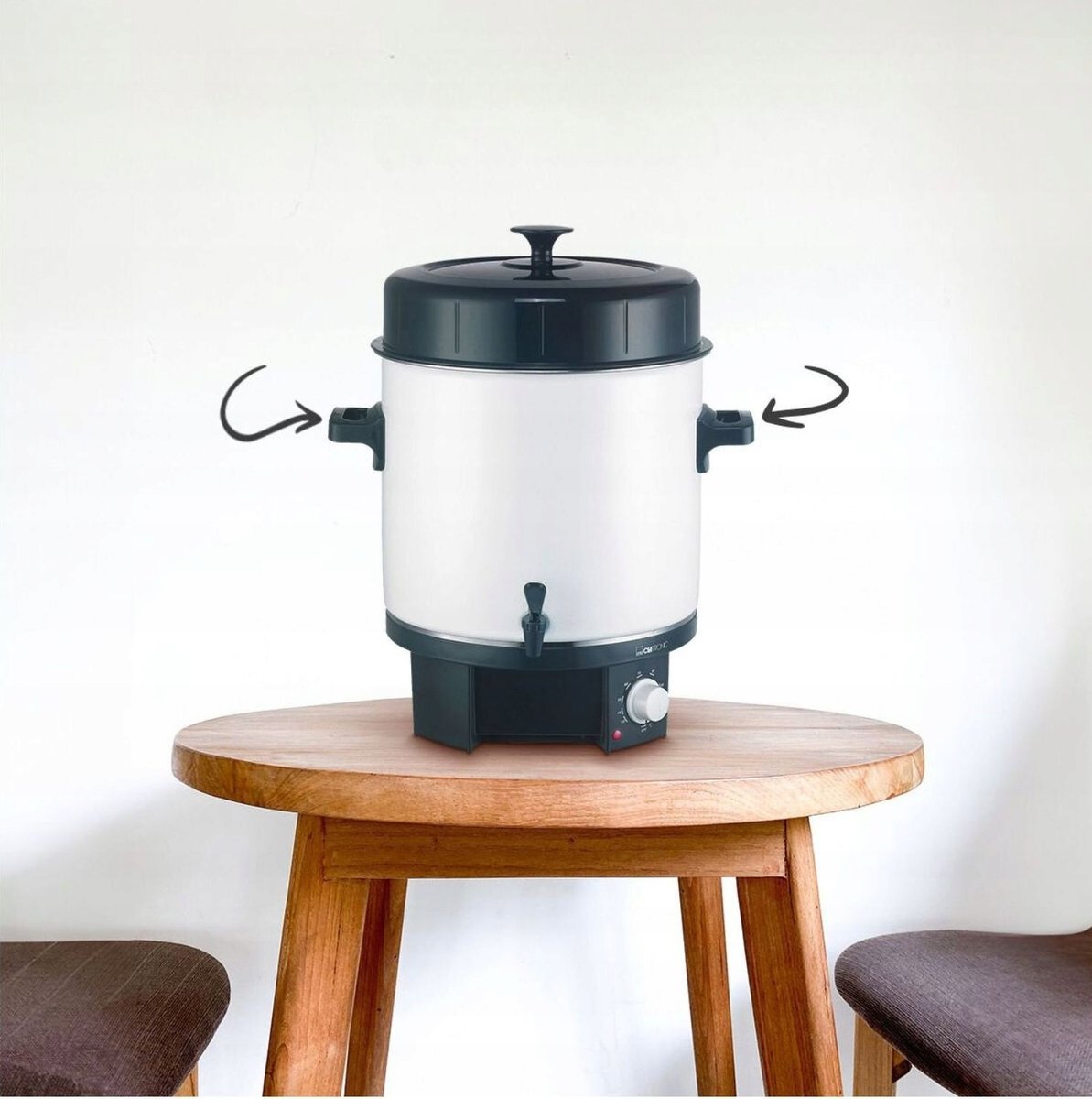 Garnek elektryczny Clatronic CTC 263135 pojemności 25 litrów doskonale sprawdzi się podczas gotowania słoików z przetworami. Dodatkowo, urządzenie wyposażone zostało w zawór kurkowy do napełniania np. winem grzanym, ponczem lub innymi gorącymi napojami.
