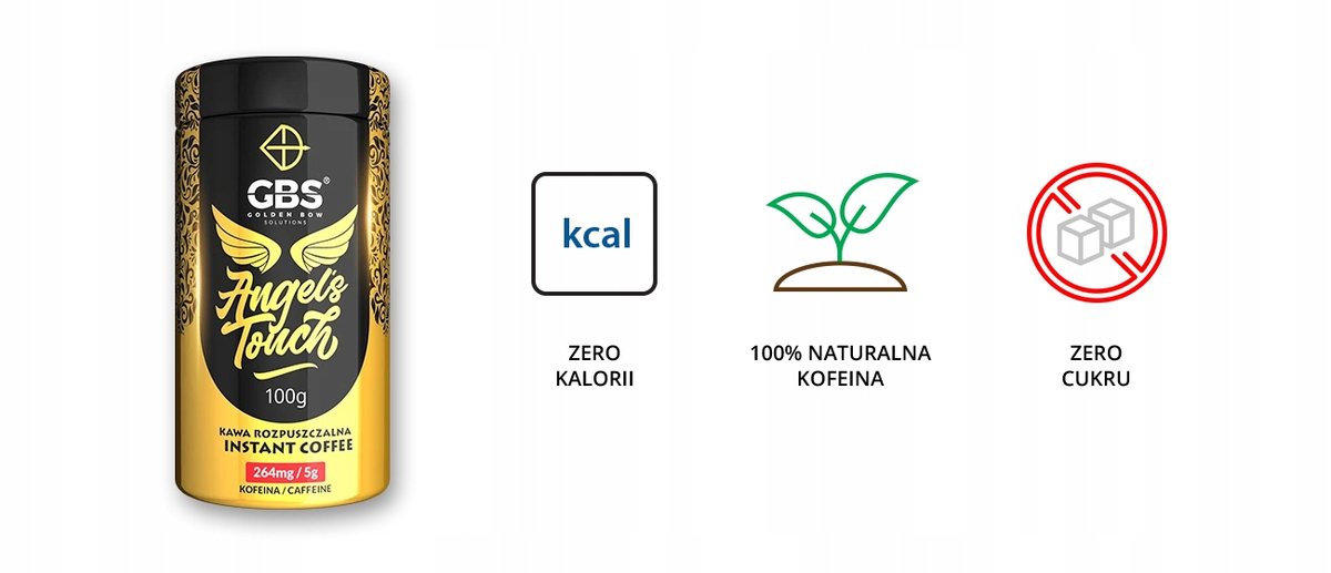 GBS Kawa Rozpuszczalna Angel's Touch posiada aż 5x więcej kofeiny niż zwykła kawa! Jeśli miewasz ciężkie poranki, albo potrzebujesz energetycznego kopa przed treningiem to kawa GBS rozwiąże Twoje problemy. Wybierz swój ulubiony aromat i zapomnij o gorzkim smaku palonych ziaren.