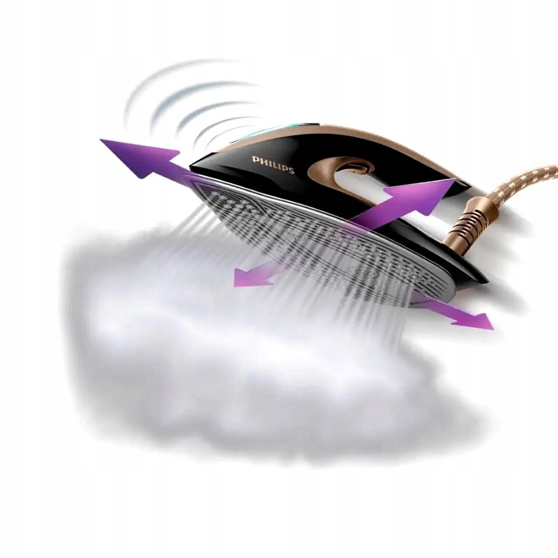 Silny strumień pary o ciśnieniu 8 barów oraz ciągły wyrzut pary 165 g/min umożliwiają szybkie i dokładne prasowanie nawet trudnych zagnieceń.