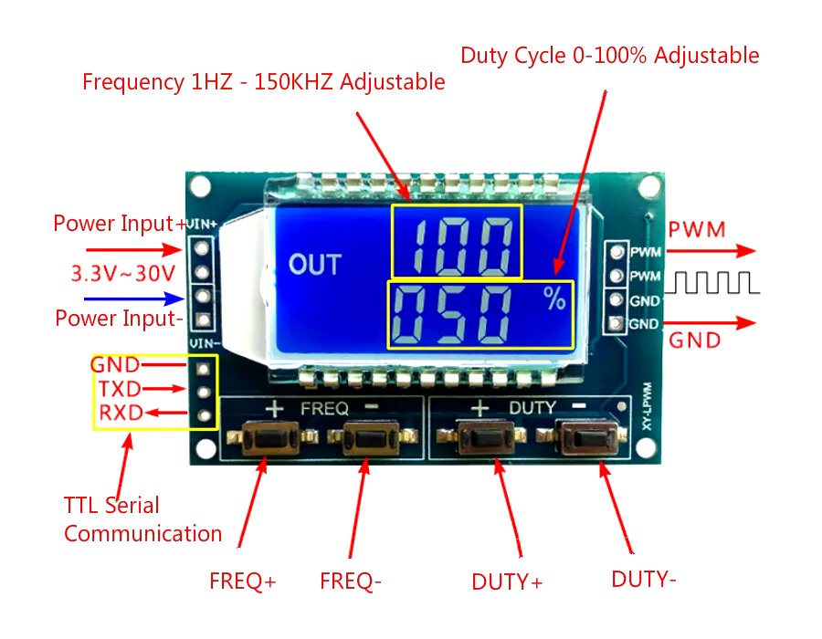 Generator sygnału prostokątnego PWMWygodny wyświetlacz LCDGenerowana częstotliwość 1Hz ~ 150kHzRegulowane wypełnienie PWMKonfiguracja za pomocą 4 klawiczyNapięcie robocze 3.3V ~ 30VNapięcie na ...
