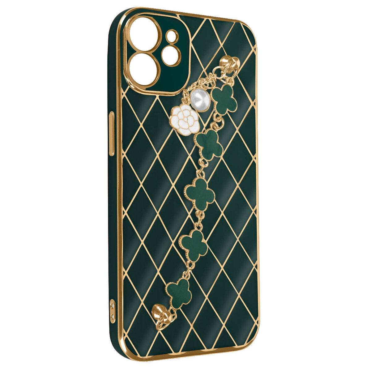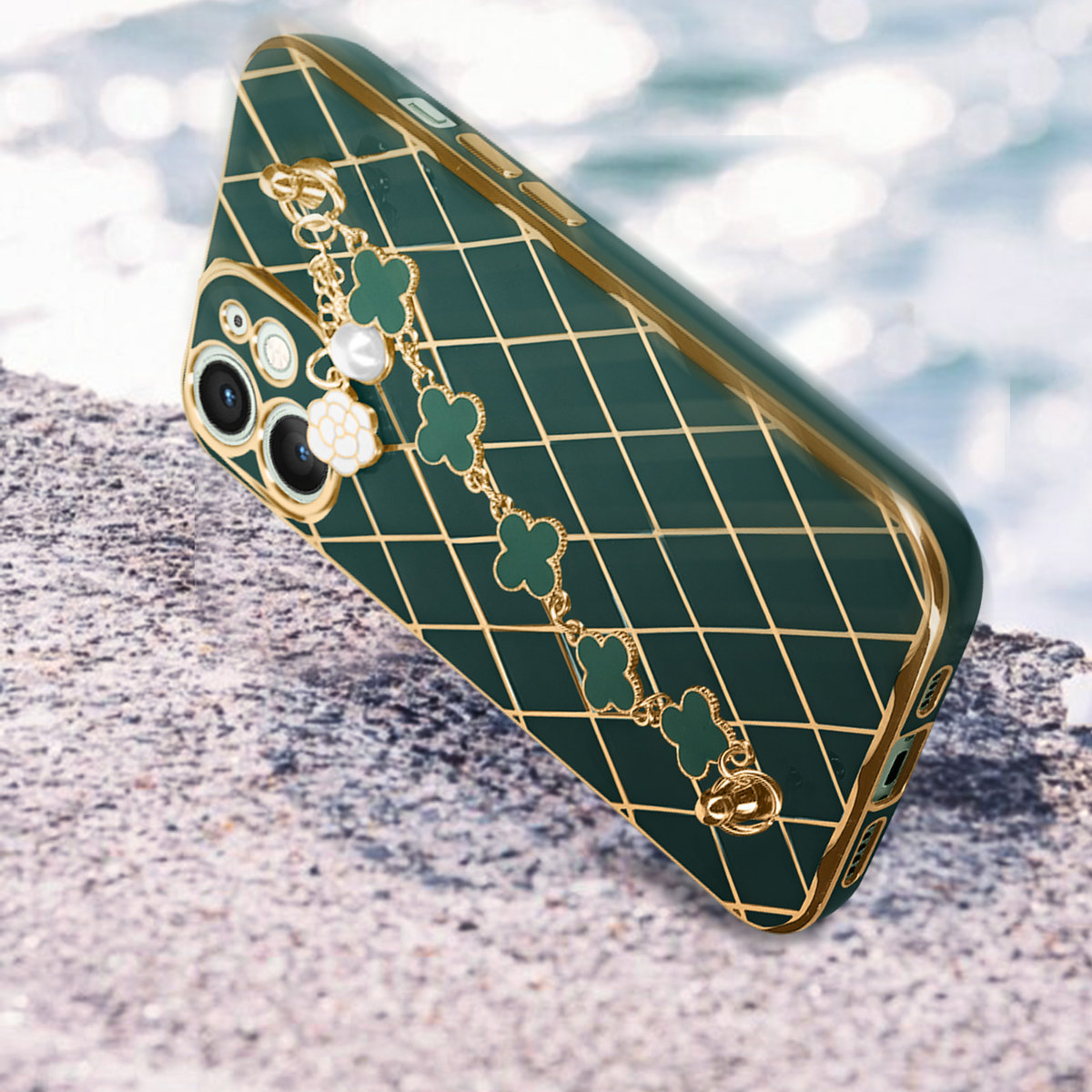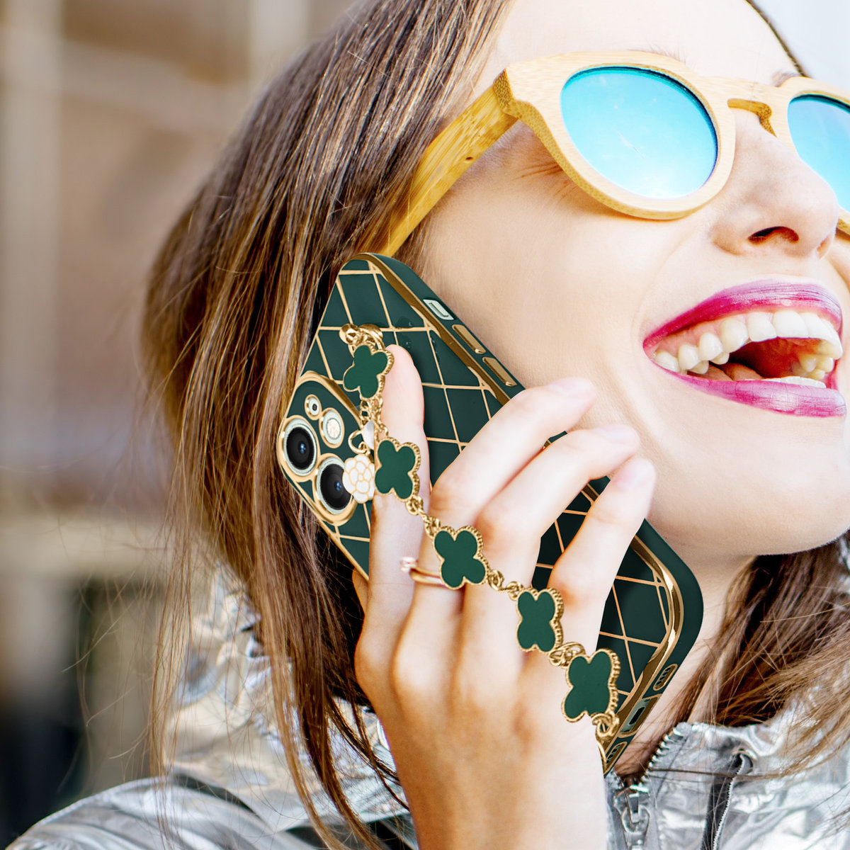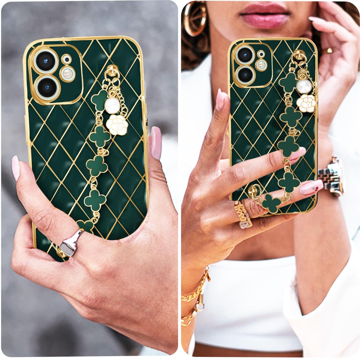 Odporne na wstrząsy i zarysowania etui do iPhone'a 12. Geometryczny wzór z metalicznym efektem zapewnia stylowy i oryginalny design. Łańcuszek z 4-listnej koniczyny: dekoracyjny, ułatwiający obsługę. Miękkie w dotyku wnętrze. Zintegrowany pasek na nadgarstek.