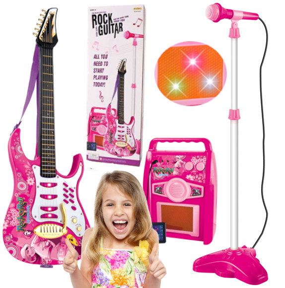 GITARA ELEKTRYCZNA + WZMACNIACZ + MIKROFON Muzyczny zestaw posiada możliwość podłączenia podkładu muzycznego z dowolnego odtwarzacz mp3. Gitara i wzmacniacz posiadają efekty świetlne. Cały zestaw ...