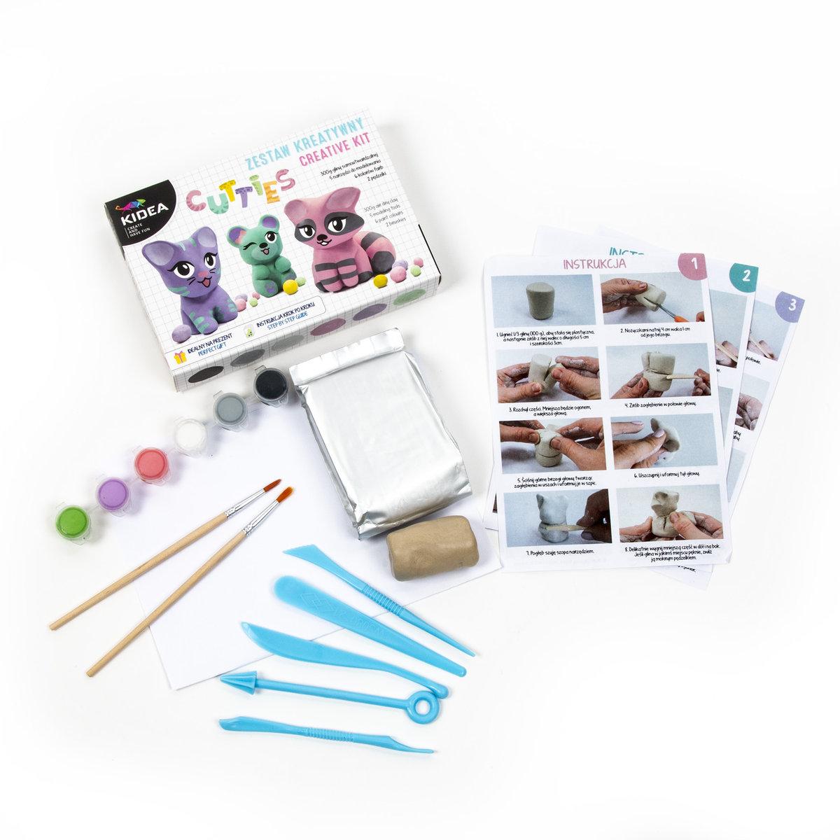 Podążając za krokami instrukcji i przy pomocy narzędzi można ulepić trzy zwierzaki - kotka, szopa oraz misia! Niezwykle kryjące farbki o pastelowych barwach nadają figurkom uroczy charakter.