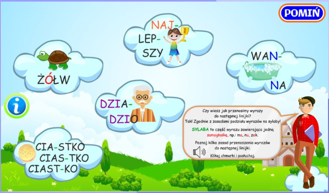 ➡️ Program multimedialny „Głoska a litera” to zestaw około 80 quizów interaktywnych i ponad 750 zadań, przygotowanych dla uczniów klas 1–4 szkoły podstawowej. Dzięki różnorodnym ćwiczeniom dzieci zdobywają wiedzę o literach, głoskach, sylabach oraz budowie wyrazów, rozwijając swoje kompetencje językowe w atrakcyjnej formie gier edukacyjnych.