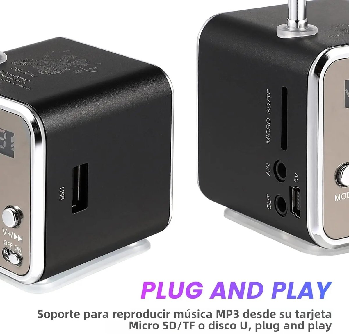Antena teleskopowa Wyposażony w antenę teleskopową głośnik zapewnia silny odbiór sygnału, poprawiając wrażenia słuchowe. Wielofunkcyjność Ten głośnik obsługuje Bluetooth, karty SD/TF, radio FM i wejście/wyjście audio 3,5 mm, oferując wszechstronne opcje rozrywki. Wyświetlacz LCD Wyświetlacz LCD wyświetla nie tylko czas odtwarzania utworu, ale także kanał audio, zapewniając jasne i łatwe do odczytania informacje. Przenośna konstrukcja Dzięki ultramałym rozmiarom 5*5*5 cm głośnik jest łatwy do przenoszenia, co czyni go idealnym dla miłośników muzyki w podróży. Trwała konstrukcja Dzięki obudowie ze stopu aluminium, która jest oksydowana i barwiona, głośnik ten zapewnia trwałość i odporność na zużycie.
