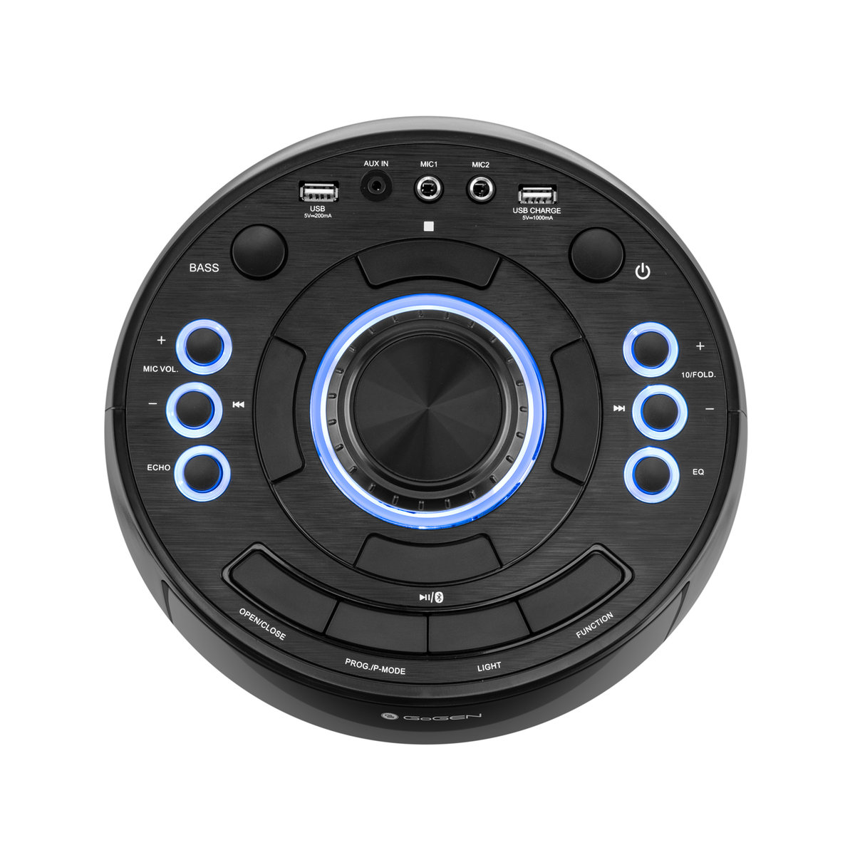 Głośnik odtwarzacz z Bluetooth®, moc 90 W, czas pracy baterii 22 h, cyfrowy tuner FM, CD, AUX, LINE-IN, mikrofon w zestawie, port ładowania USB, efekty świetlne