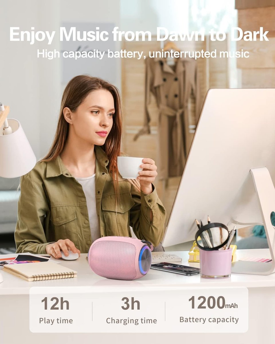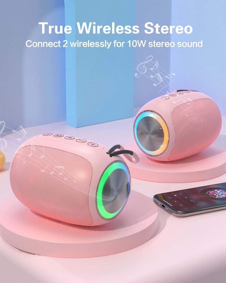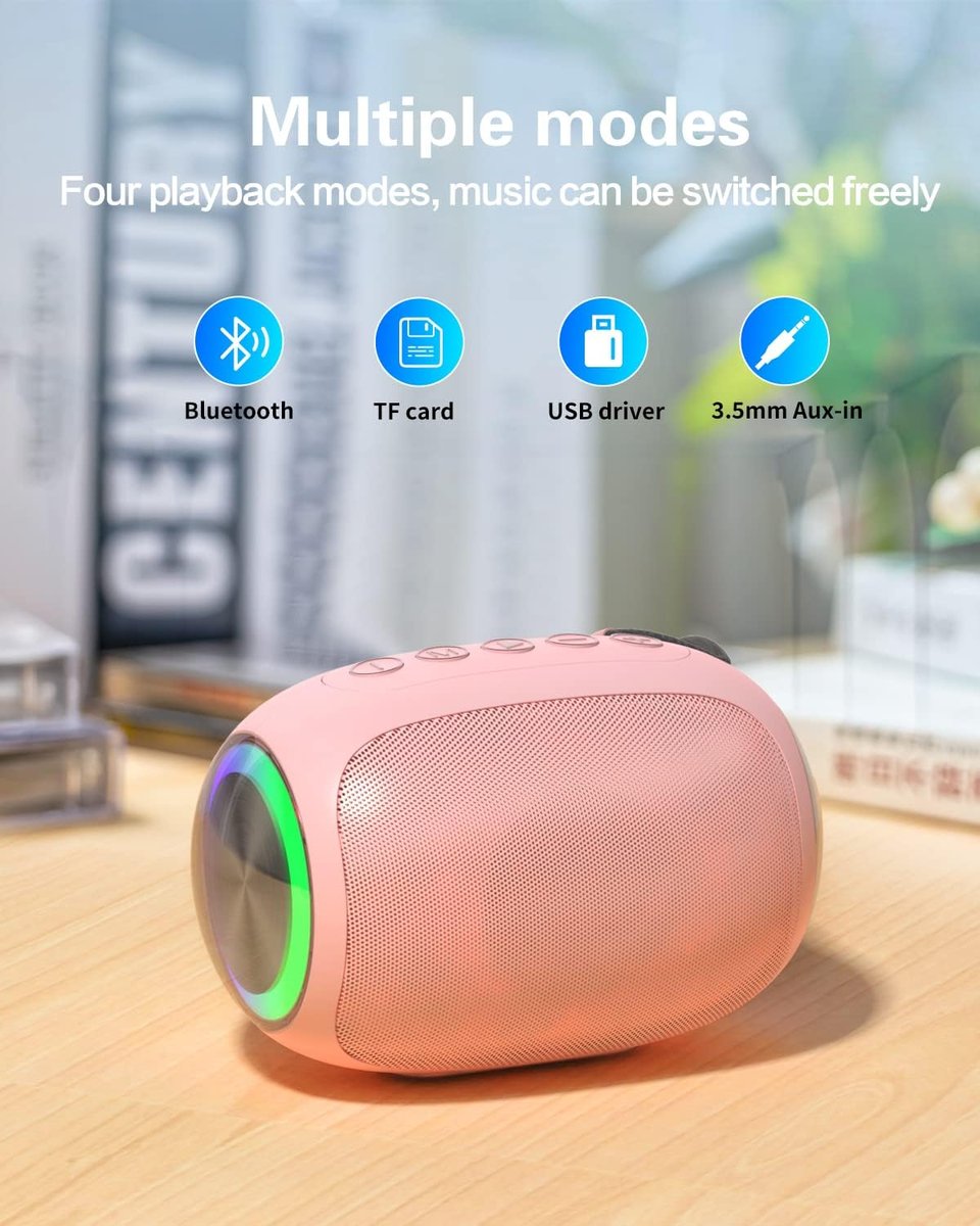 [Jedno urządzenie z dwoma wibratorami basowymi] – Głośniki Bluetooth charakteryzują się kompaktową obudową, która zapewnia czysty dźwięk o mocy 5 W. Małe głośniki są starannie zaprojektowane z obu stron, z dwoma pasywnymi wibratorami basowymi i kolorowymi światłami. Dobre wrażenia słuchowe i atmosfera zaczynają się od pięknych głośników. [Małe i lekkie] Głośniki bezprzewodowe są przenośne i niewielkie, ważą mniej niż 227 g, mają 11,5 cm długości i maksymalną średnicę 8,15 cm. Wyposażone są również w linki do zawieszania, łatwe do przenoszenia, idealne na piesze wędrówki, jogging, jazdę na rowerze, kemping i podróże. Dobry prezent dla dzieci lub przyjaciół przyniesie ciepło i radość. [Głośniki Bluetooth z dłuższym czasem odtwarzania] Przenośne głośniki odtwarzają muzykę do 10 godzin przy 2/3 głośności (bez światła). Możesz słuchać muzyki na świeżym powietrzu z przyjaciółmi lub rodziną. Czas odtwarzania zależy od rodzaju muzyki i poziomu głośności, a także od włączania i wyłączania kolorowych świateł. Naciśnij i przytrzymaj przycisk „m”, aby wyłączyć światła. [Obsługuje wiele trybów odtwarzania] Małe głośniki wyposażone są w gniazda na karty TF (obsługuje formaty WAV/MP3), wejście AUX 3,5 mm, port pamięci flash USB oraz gniazdo zasilania typu C. Możesz łatwo wybrać preferowany tryb odtwarzania muzyki. [Obsługuje synchronizację z dwoma połączeniami] Obsługuje prawdziwie bezprzewodowe stereo w trybie odtwarzania Bluetooth. Jeśli wolisz większe głośniki, możesz bezprzewodowo połączyć 2 głośniki, aby uzyskać głośniejszy dźwięk dual stereo o mocy 5 W. [W zestawie] Przenośny głośnik Bluetooth, przewód zasilający typu C, przewód audio 3,5 mm, instrukcję obsługi, 365-dniowe, przyjazne wsparcie techniczne i przyjazną obsługę klienta.