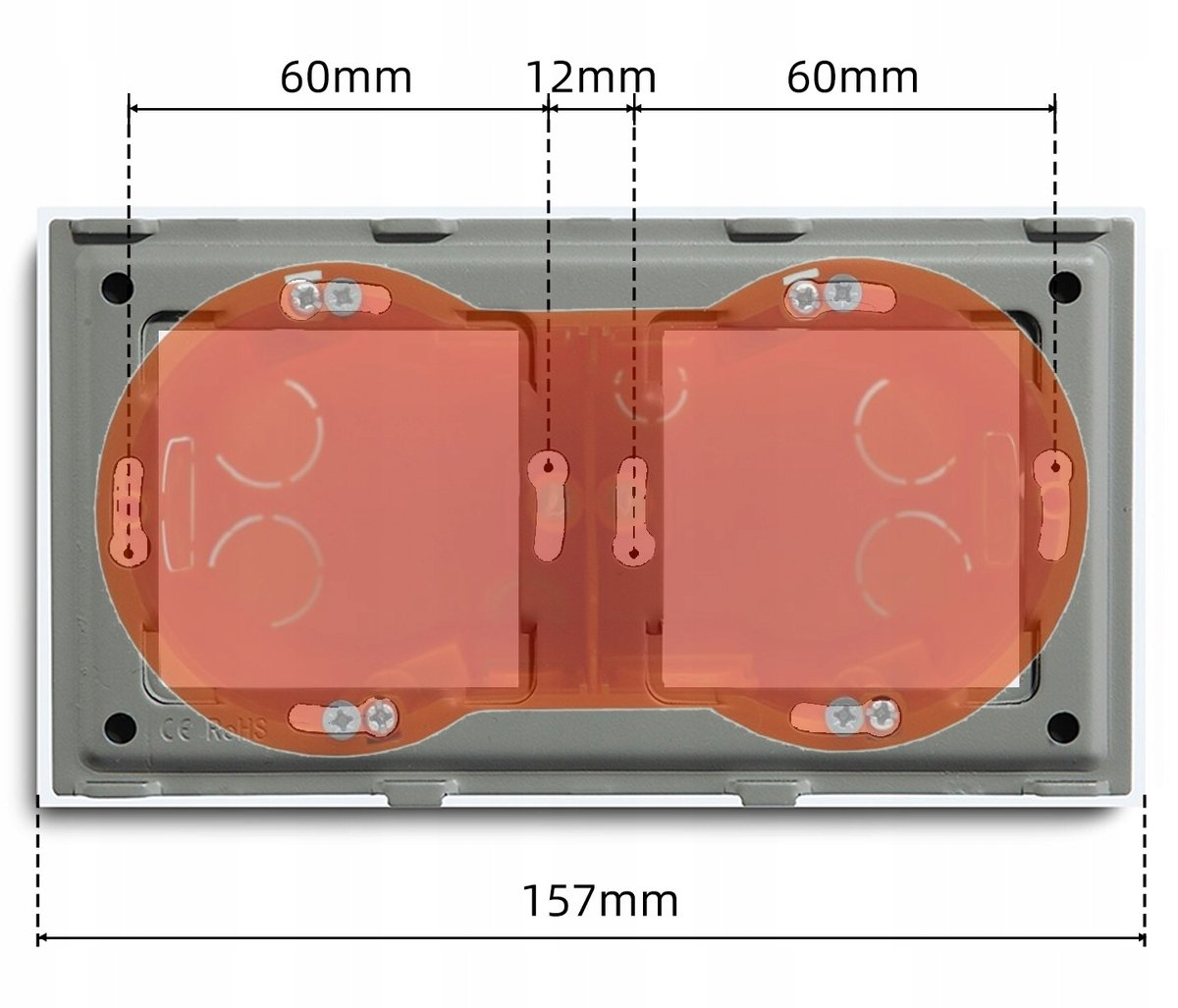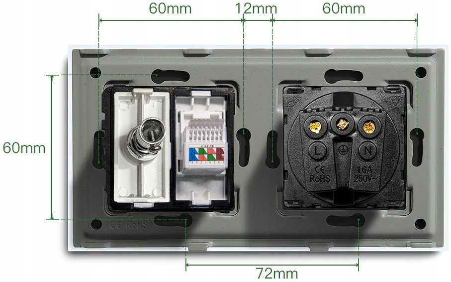 - Wymiar dopasowany do rozstawu puszek ściennych o śr. 60mm stosowanych jako standard w budownictwie