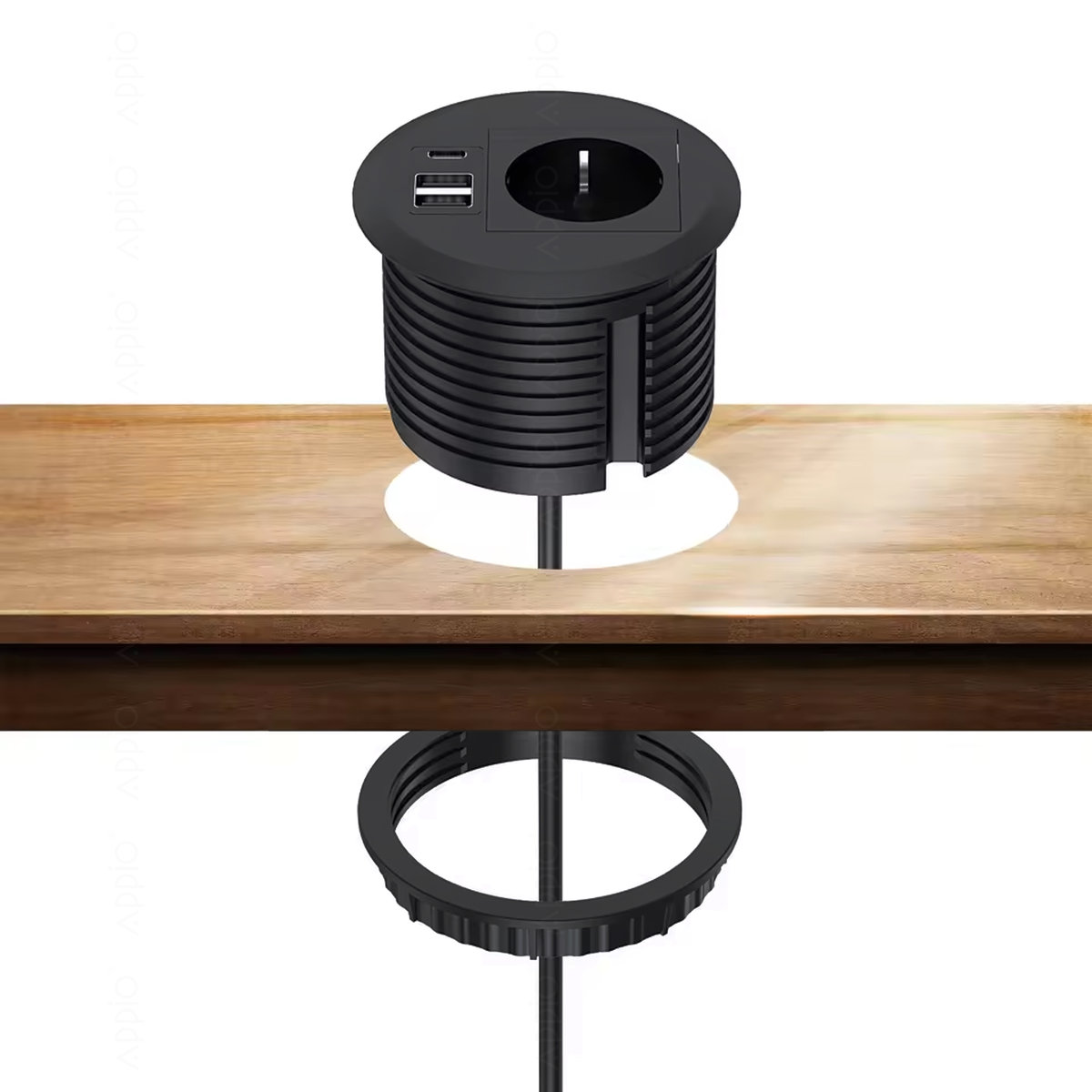Gniazdo sieciowe z uziemieniem, połączone z portami USB w obudowie chowanej w blat, wykonany z wysokiej jakości materiałów, łatwy w montażu, odporny na uszkodzenia.
