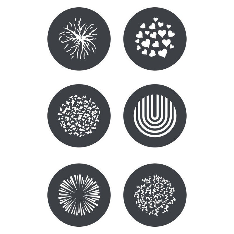Zestaw Gobo GP-GS2 to akcesorium zawierające 6 efektów gobo do nakładek projekcyjnych GP, czyli dedykowanych do systemu G-Mount (dla lamp MG1200Bi i MG2400Bi).