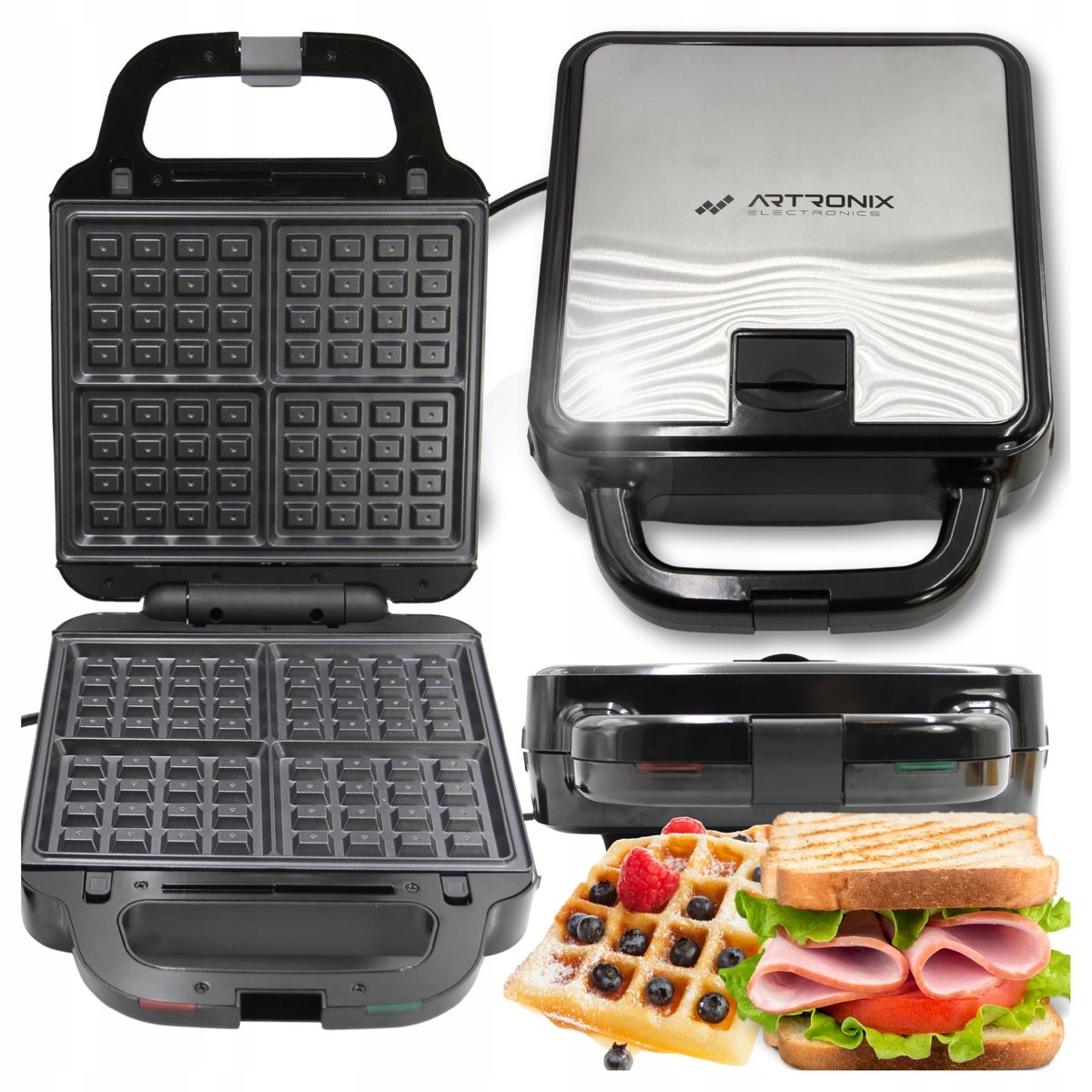 ➡️ 3 zestawy wymiennych płyt (grill, gofrownica, toster)