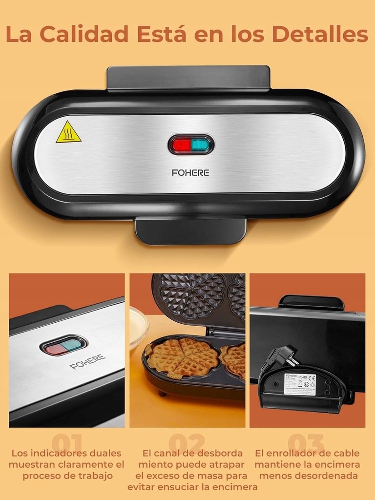 - Łatwe czyszczenie: Ze względu na nieprzywierającą powłokę płyty waflowej do pieczenia wymagana jest tylko niewielka ilość oleju, nie przypala się, patelnia z powłoką nieprzywierającą, wszystkie gofry można całkowicie poluzować i nie przywierają do formy do pieczenia, dzięki czemu gofrownica jest bardzo łatwa do czyszczenia.