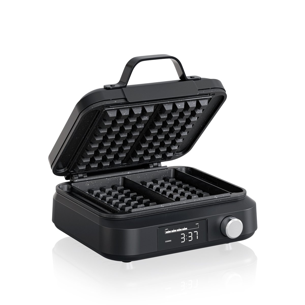 Płyta grzewcza pozwala na jednoczesne upieczenie dwóch dużych gofrów. Dzięki temu to idealne rozwiązanie zarówno na rodzinne śniadanie, jak i szybki deser dla gości. Symetryczne płyty grzewcze zapewniają równomierne rozprowadzanie ciepła, dzięki czemu oba gofry są idealnie wypieczone – złociste, chrupiące na zewnątrz i miękkie w środku.