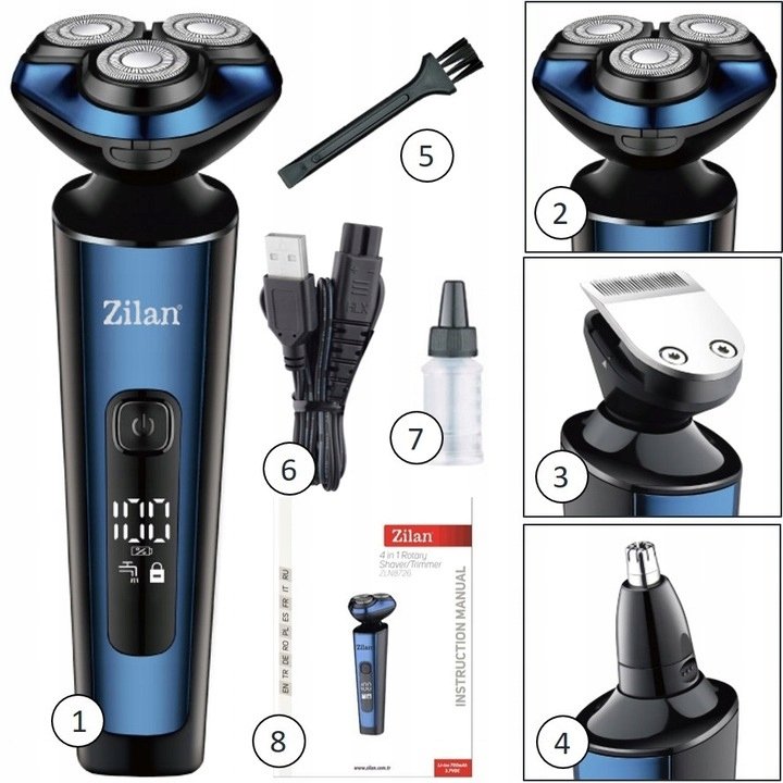 ❑ Czas pracy bezprzewodowej: 90MIN | ❑ Czas ładowania: 60MIN | ❑ Ładowanie 3w1 USB | ❑ 3 Wymienne głowice | ❑ Łatwe czyszczenie | ❑ Pędzelek do czyszczenia | ❑ Olej maszynowy | ❑ Klasa wodoodporności: IPX6