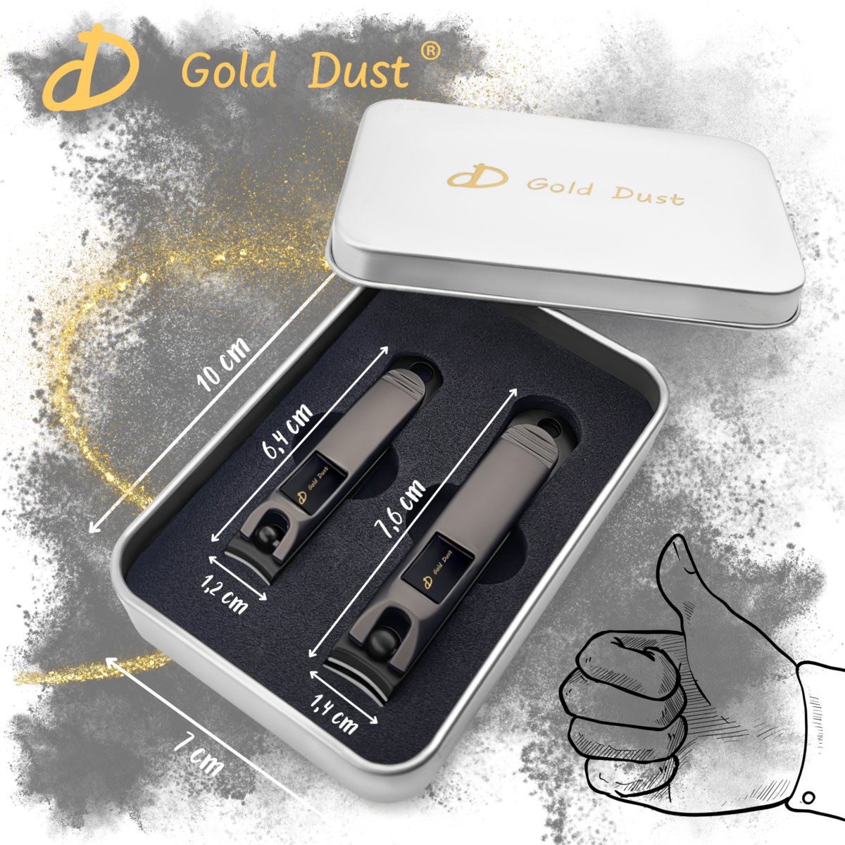 Zestaw Gold Dust to dwa obcinacze zestrojone z eleganckim metalowym opakowaniem. Tak dobrane narzędzia to obowiązkowy element wyposażenia osoby nie idącej na kompromisy.