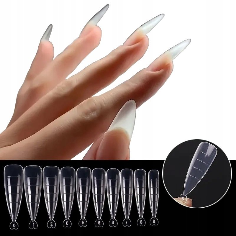 Dostępny kształt form: wąski migdał, stiletto, zakończony serduszkiem. Formy są wąskie, odpowiednie na wąskie paznokcie.