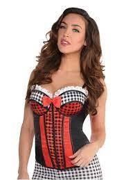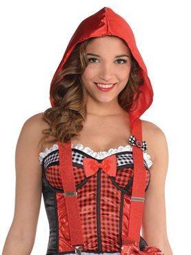 Gorset w stylu Czerwonego Kapturka.Kolory: czerwony, czarny, biały.Bez ramiączek.Dekolt w kształcie serca.Bogato zdobiony.Skład: 100% poliester.