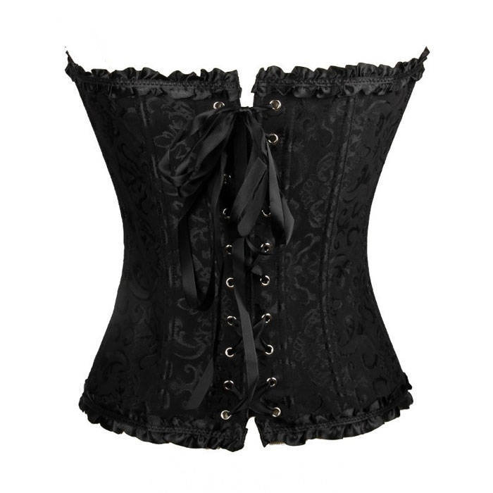Gorset zapinany jest z przodu na ozdobne, metalowe haftki, natomiast tył wyposażono w regulowane wiązanie, które umożliwia idealne dopasowanie do sylwetki. Marszczona lamówka u góry i dołu gorsetu nadaje całości subtelnej, romantycznej estetyki. Idealny zarówno do zmysłowych stylizacji bieliźnianych, jak i jako odważny element wieczorowego outfitu. W zestawie znajdują się także pasujące stringi.