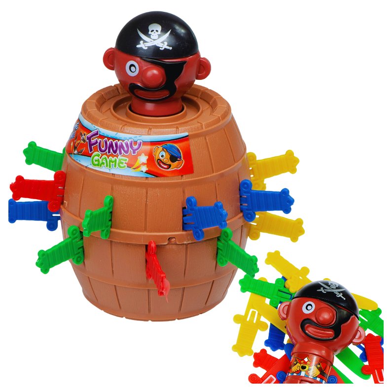 Zabawa polega na wkładaniu kolorowych mieczy w beczkę. Ale uwaga! Jeśli trafisz na zły otwór, pirat wyskoczy jak z procy! Wygrywa ten, kto jako pierwszy pozbędzie się swoich mieczy lub wkłada ich więcej, zanim pirat wystrzeli.