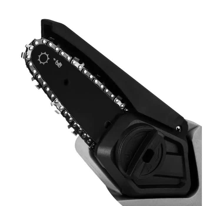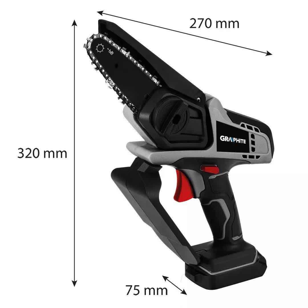 Łańcuchowa mini pilarka akumulatorowa od marki GRAPHITE. Narzędzie kompatybilne z bateriami litowo-jonowymi 18 V systemu Energy+. Pilarka wyposażona została w łańcuch o długości 12 cm, zapewniający maksymalne cięcie 10 cm. Urządzenie polecane do pracy w ogrodzie oraz zadań przy wycince i przycince gałęzi drzew lub krzewów. Ze względu na kompaktowe rozmiary, umożliwia sięgnięcie do trudniej dostępnych miejsc.